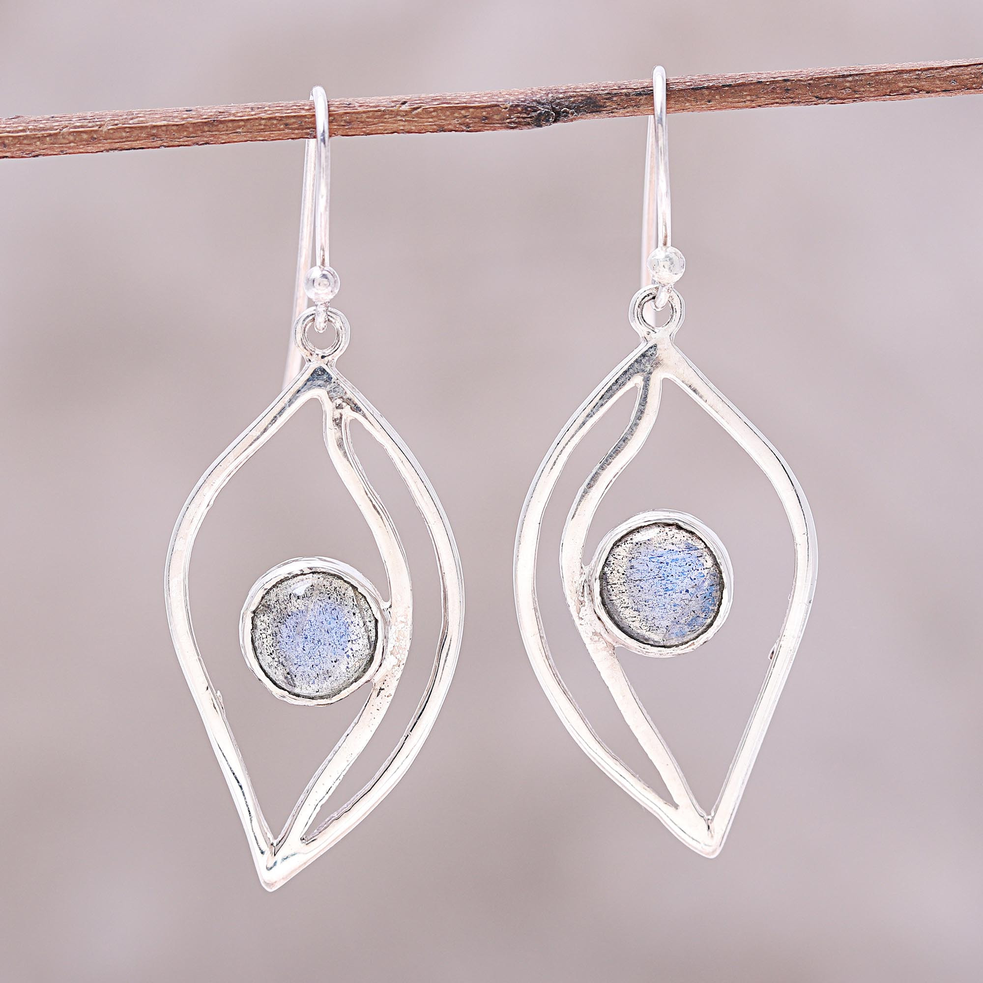 Framed by leafy motifs in high-polish sterling silver, two natural labradorite stones are featured in a pair of dangle earrings from India. Chintan presents the earrings, working with local artisans to craft them.