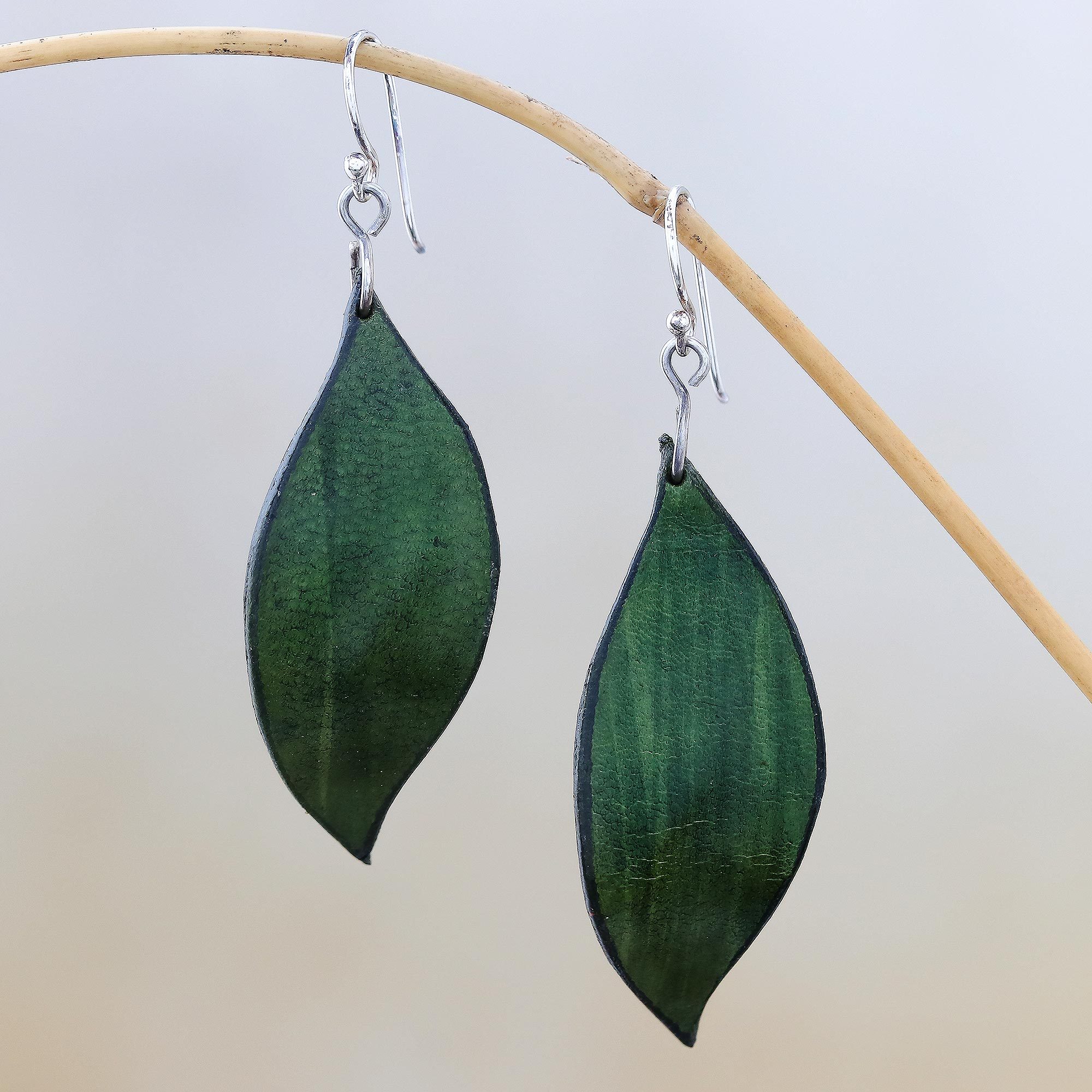 Fanciful in their beauty, these dangle earrings are created by Chang in Thailand. Two lovely leaf-like shapes are handcrafted from leather that is dyed green. Each earring swings from a hook of sterling silver.