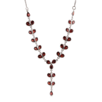 Leaves grow around this precious necklace, each with a crimson hue of passion. India's Bhavesh presents this stunning Y necklace, whose details are composed of sterling silver and natural garnet jewels, each in a pear cut and all totaling 15 carats.