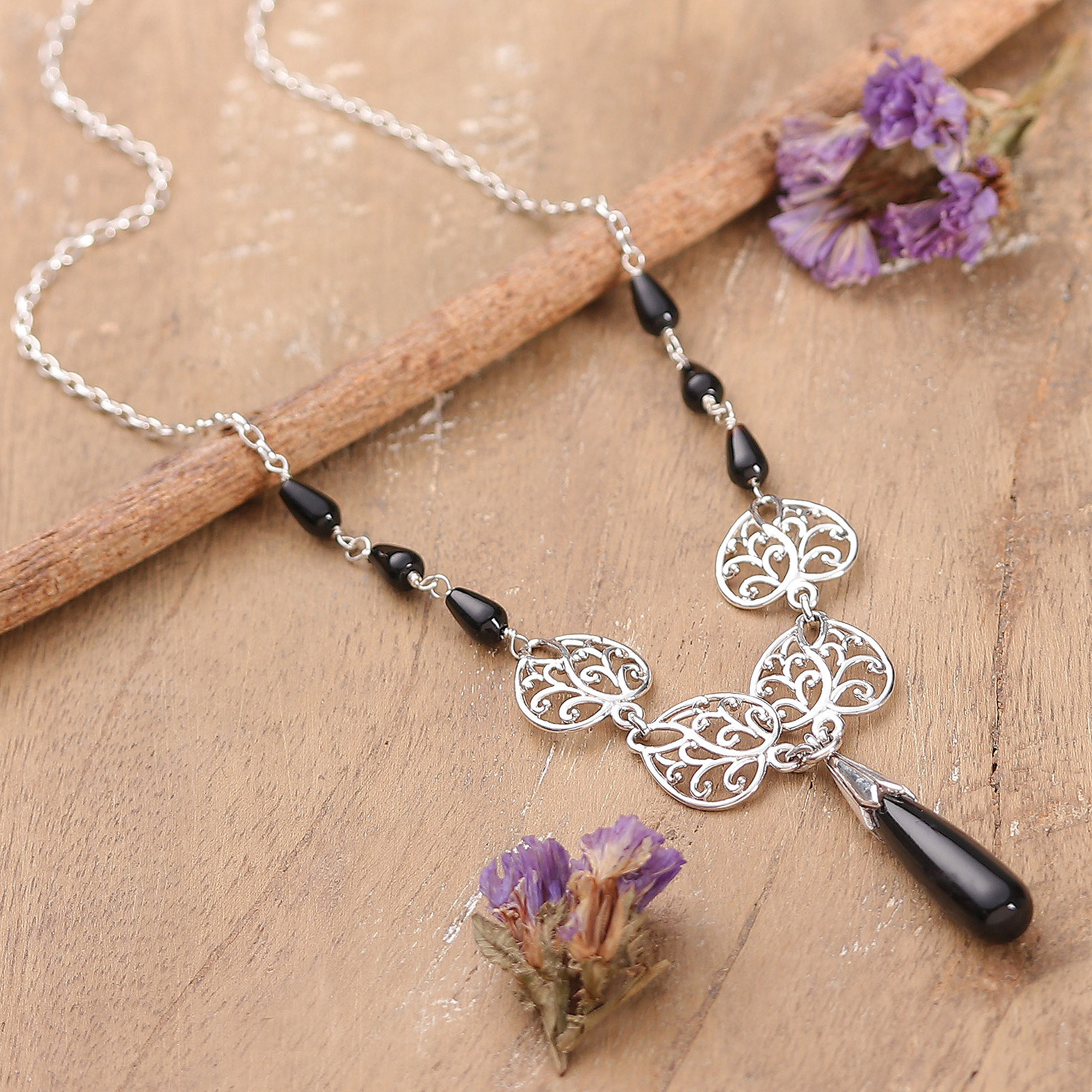 Nature-inspired glamour takes over Shubhra Sing's newest design—a sublime pendant necklace of nocturnal beauty. Mystic black onyx gems add sophistication to the sterling silver leafy elements that compose the accessory, symbolizing power and enigma.