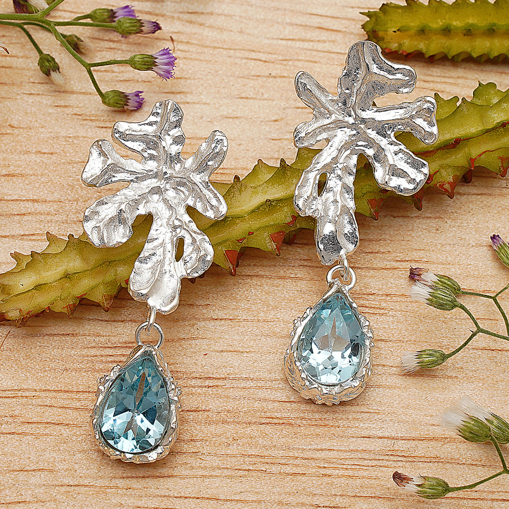 The staghorn fern's proud leaves grow dazzlingly in these dangle earrings by Yuli of Bali. Inspired by the island's green scapes, this sterling silver design crowns its exotic details with faceted blue topaz stones, totaling five carats of celestial and loyal light.
