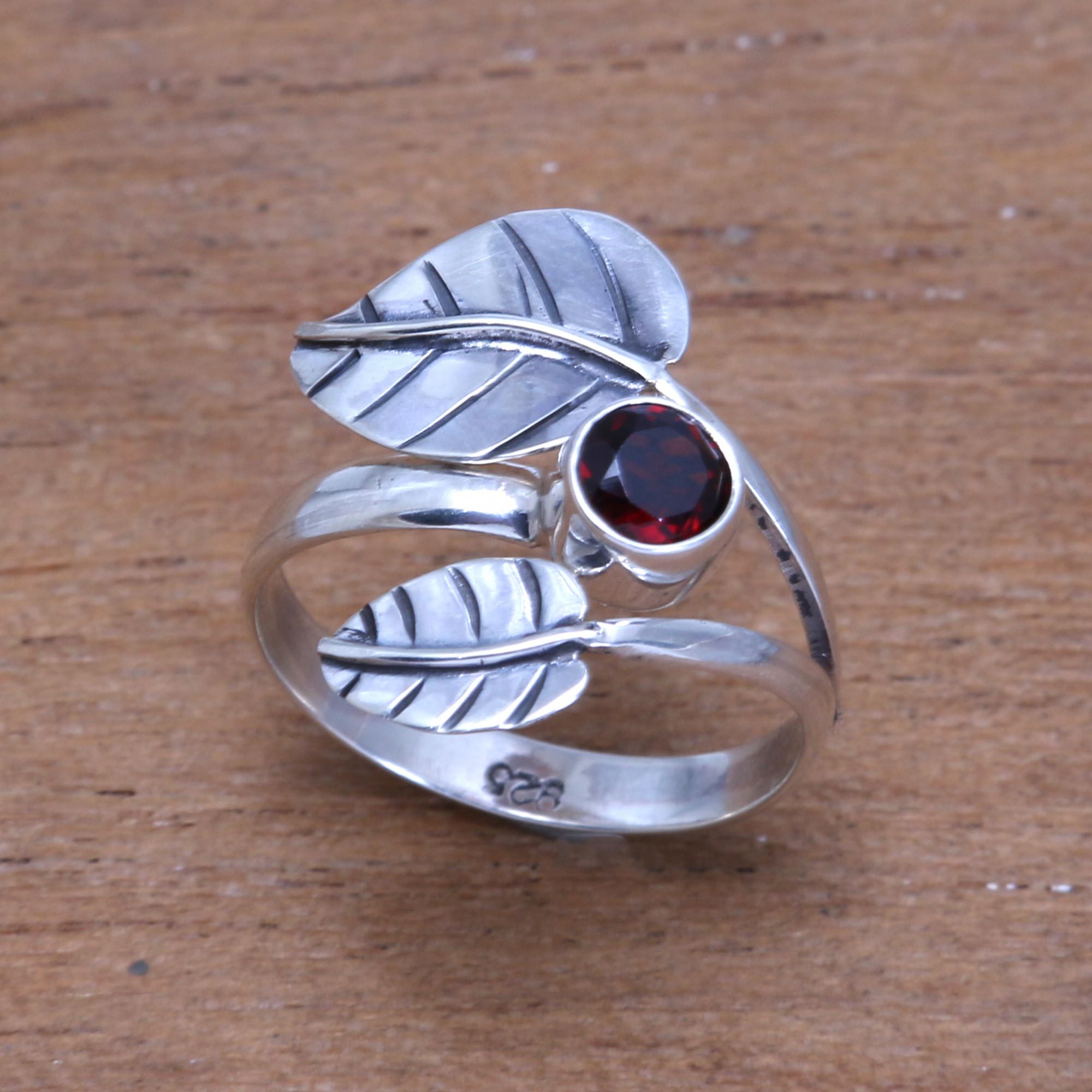 Accompanied by a sparkling gemstone of faceted garnet, two gleaming leaves are crafted from sterling silver. Wayan Asmana presents this cocktail ring, crafted by Balinese artisans. The ring circles the finger with a simple sterling band.