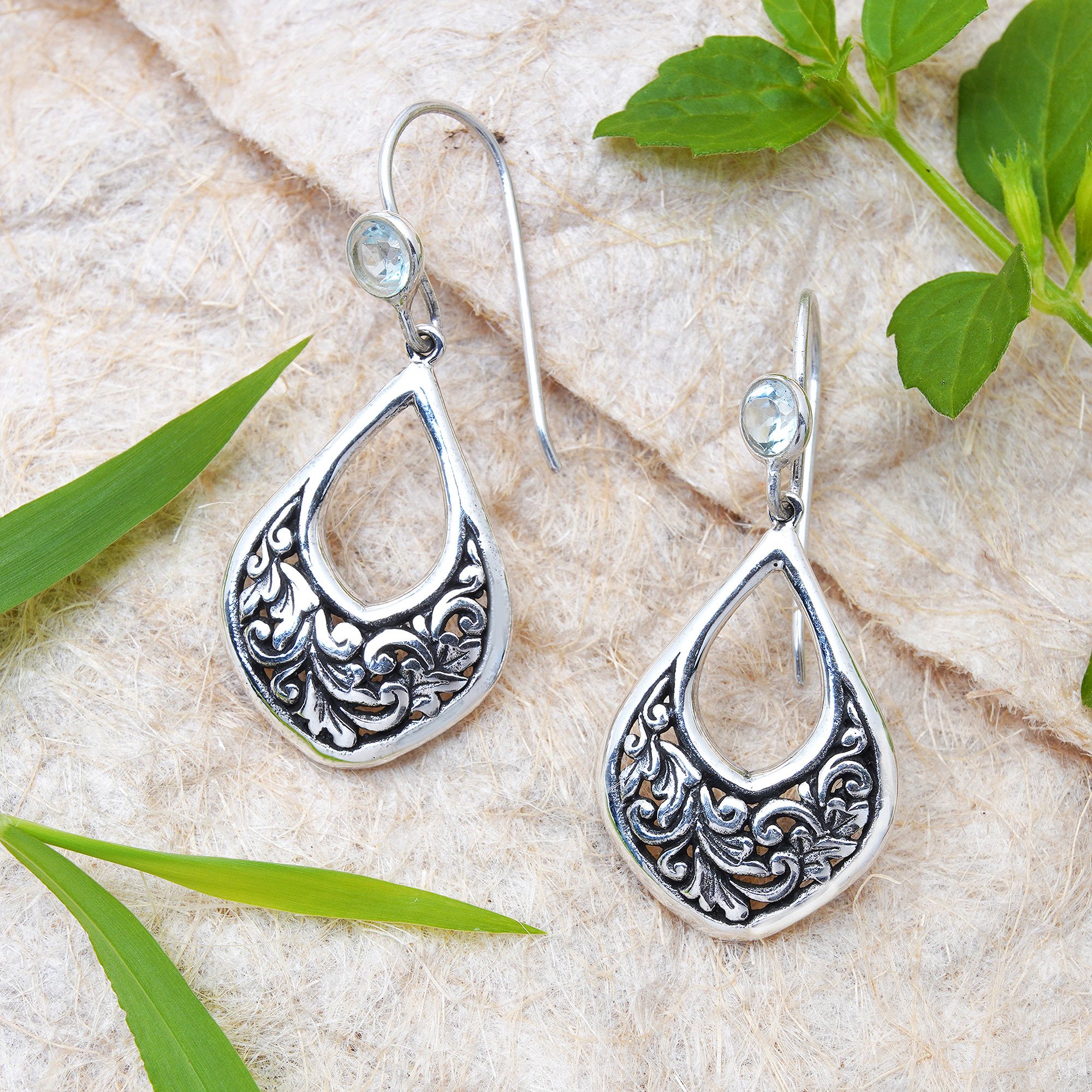 Boasting delicate vine motifs, these sterling silver dangle earrings shimmer with the brilliance of blue topaz. Each sparkling gem is framed by intricate openwork, the polished and oxidized finishes adding depth and texture. Created by Bali's Ekayani, these earrings bring natural beauty to life with timeless elegance.