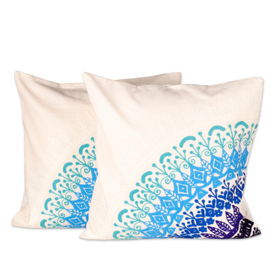 In hues of blue, cerulean, turquoise and white, intricate mandala and leaf motifs are embroidered onto this pair of eggshell cotton cushion covers from India. Anil Khandelwal crafts this pair, embellished with the region's classic beauty and equipped with zippers on the back.