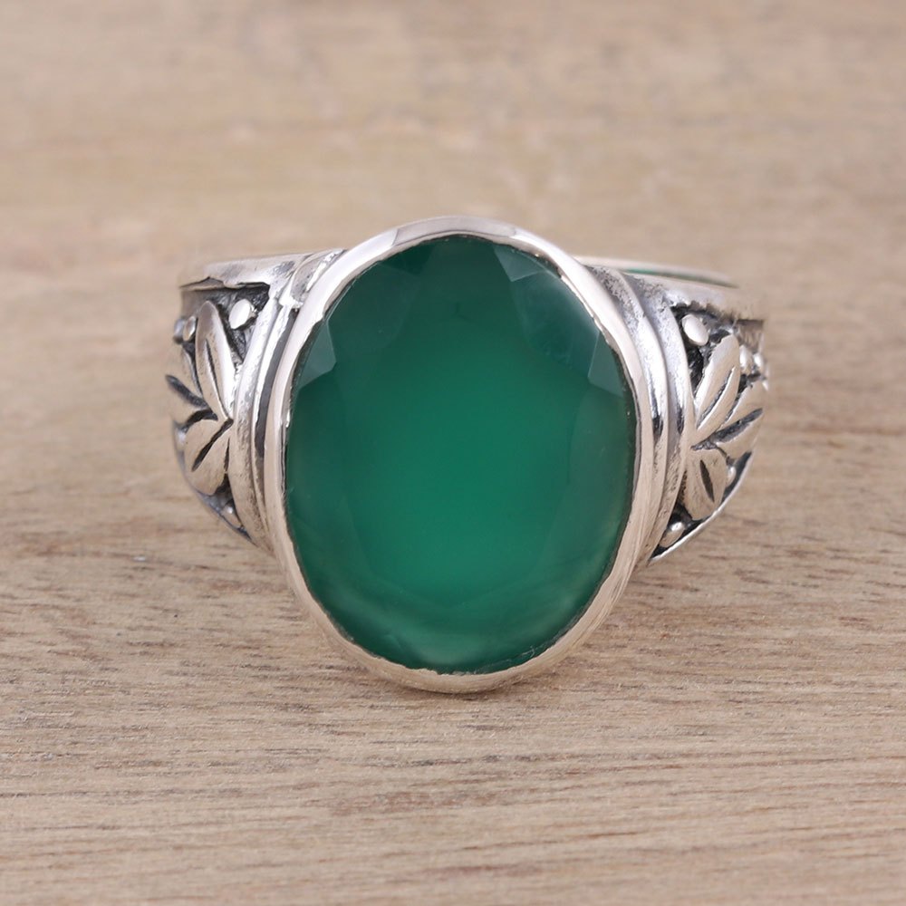 A 5.5-carat stone of green onyx is faceted to reveal verdant angles in this cocktail ring from India. Chintan presents the ring, featuring a sterling silver band with leaf motifs.