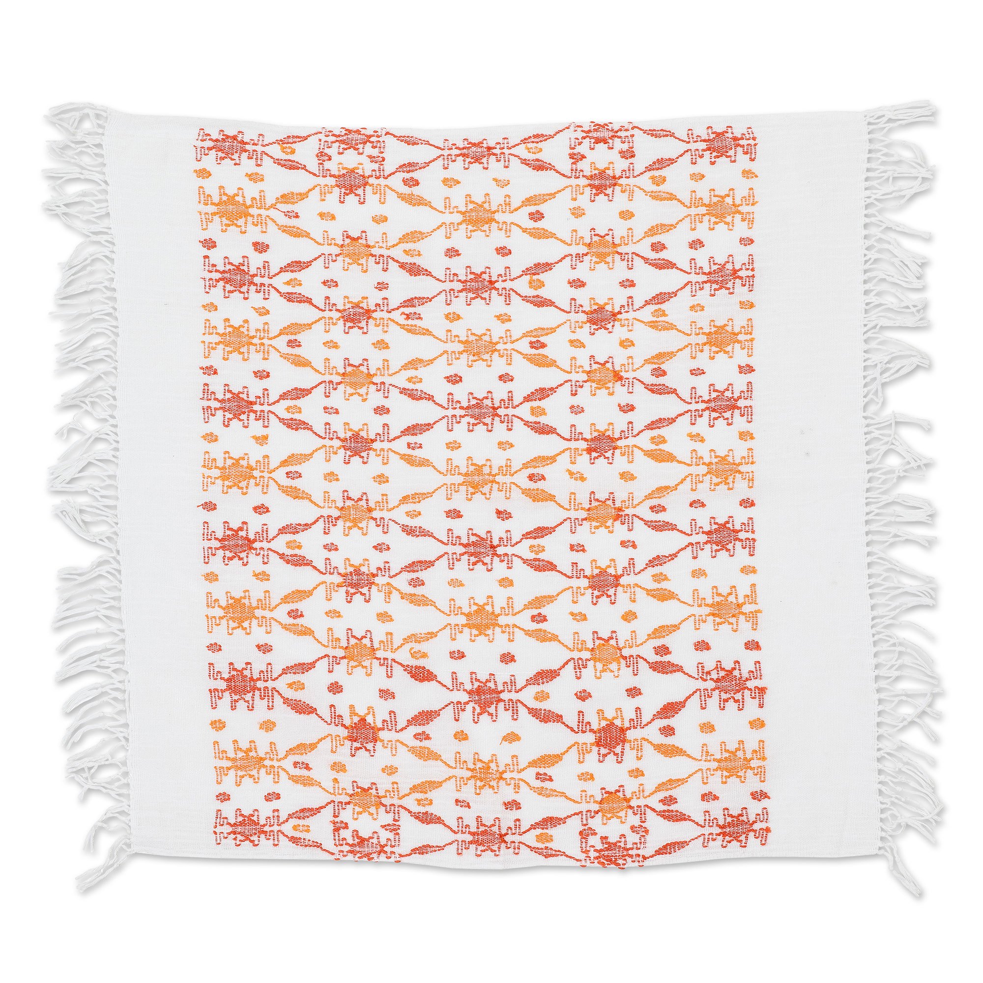 Handwoven in the traditional Pic'bil style, the Ixbalam Ke Women Weavers's newest creation captures the charming essence of the regional forests in the leafy details decorating this refined placemat. Made from cotton, the piece features a combination of orange and red hues arranged in the geometric pattern that decorates the accessory, whose white base tone allows for a sweet illusion.