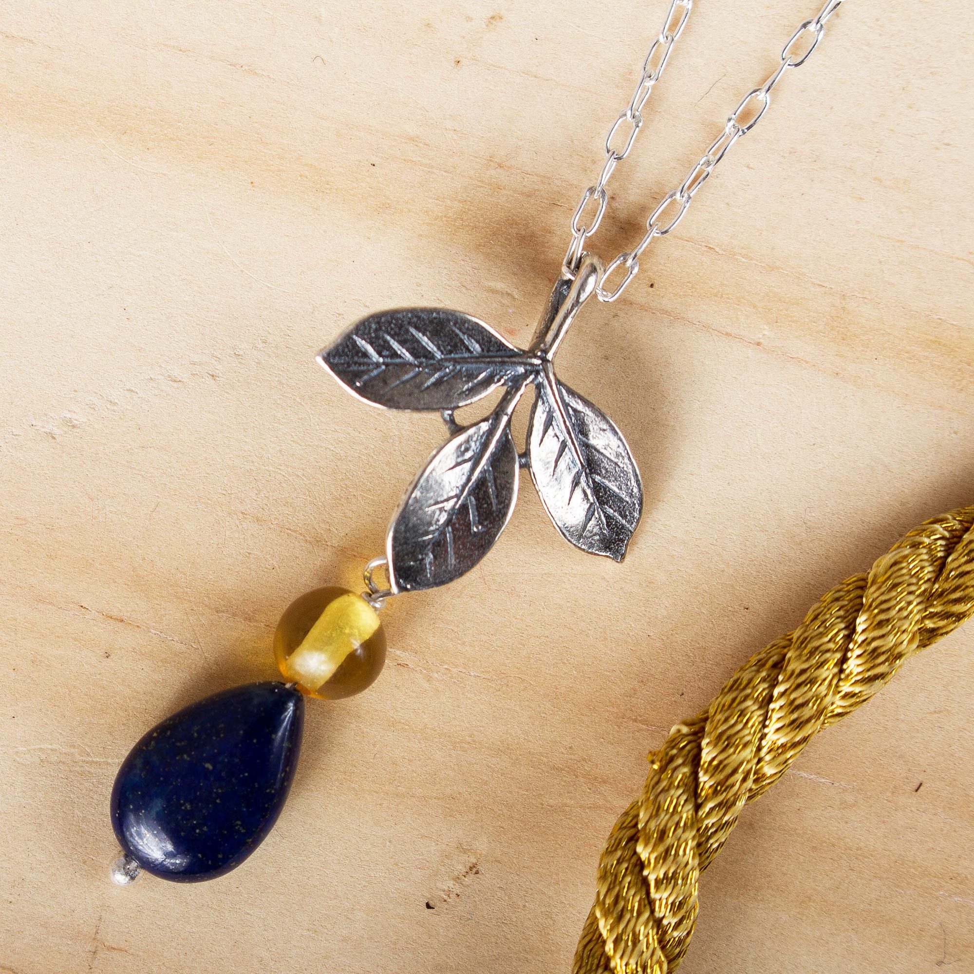 Inspired by the beauty of the indigo plant, Mexican artisan Flora Maria creates this pendant necklace. A lovey trio of indigo leaves is crafted from sterling silver, from which dangle lapis lazuli and amber.