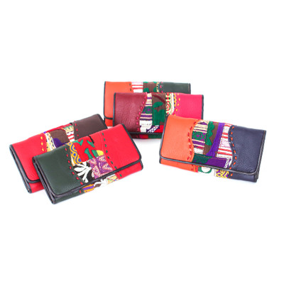 Leather Cotton Wallet with Hill Tribe Embroidered Woven Art, 'Vibrant Beauty'