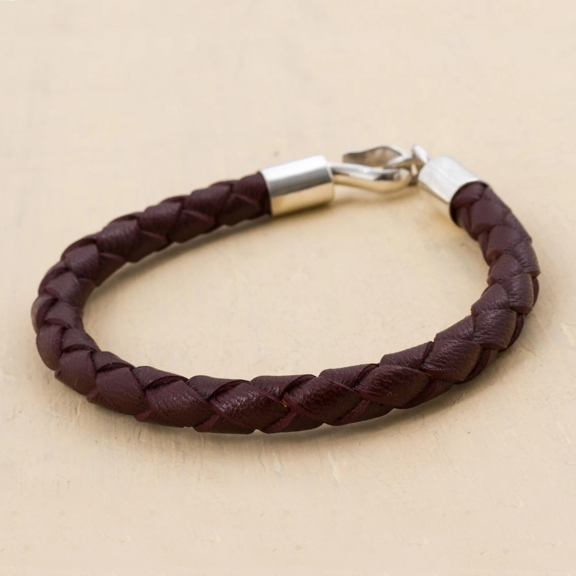 Leather with Fine Silver Braided Men's Bracelet, 'Earth Elements'