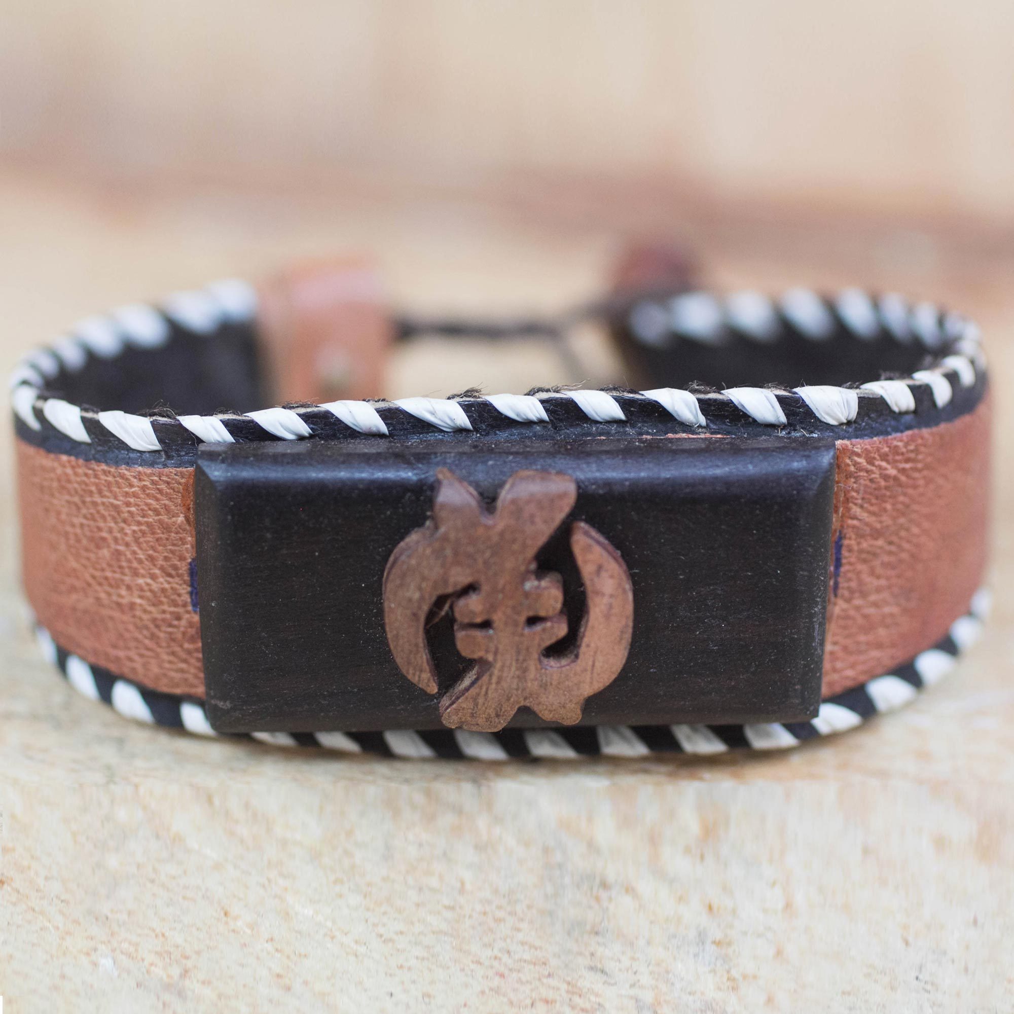 Leather Wristband Bracelet with Wooden Accent, 'Ghanaian Symbol'