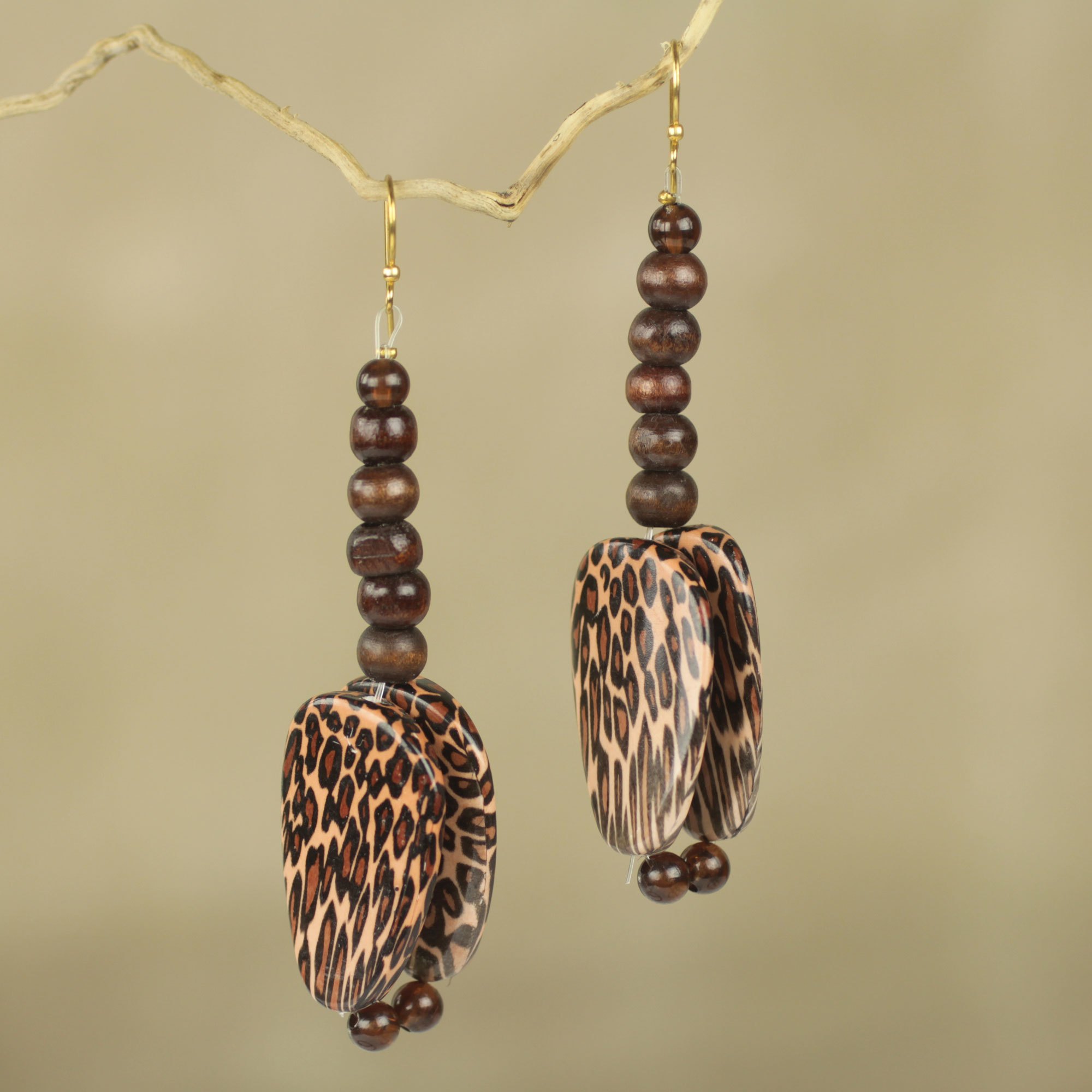 Ghanaian jewelry designer Rita Addo Zakour presents a pair of earrings with animalistic appeal. The hand-crafted dangle earrings feature sassy beads of recycled plastic with a leopard print motif. Flanking the spotted beads are small spheres of brown sese wood. The earrings swing from brass hooks. The artisan names them ayeyi, which means "praise" in the Akan dialect.