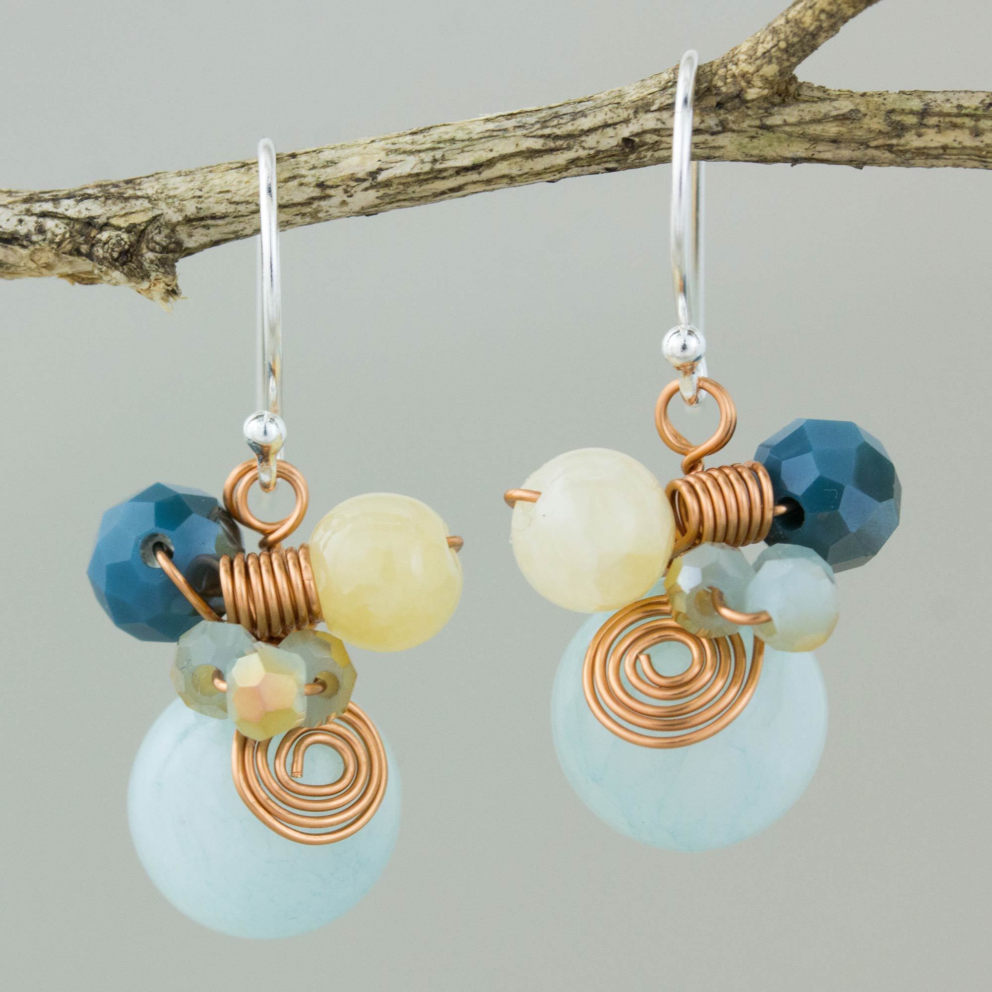 Resembling blue and teal bubbles floating in the air, these earrings are a playful addition to a fun, casual outfit. Thai artist Nareerat crafts these dangle earrings from a combination of dyed round quartz, glass beads, and twisted copper wire accents. The earrings hang from sterling silver hooks.