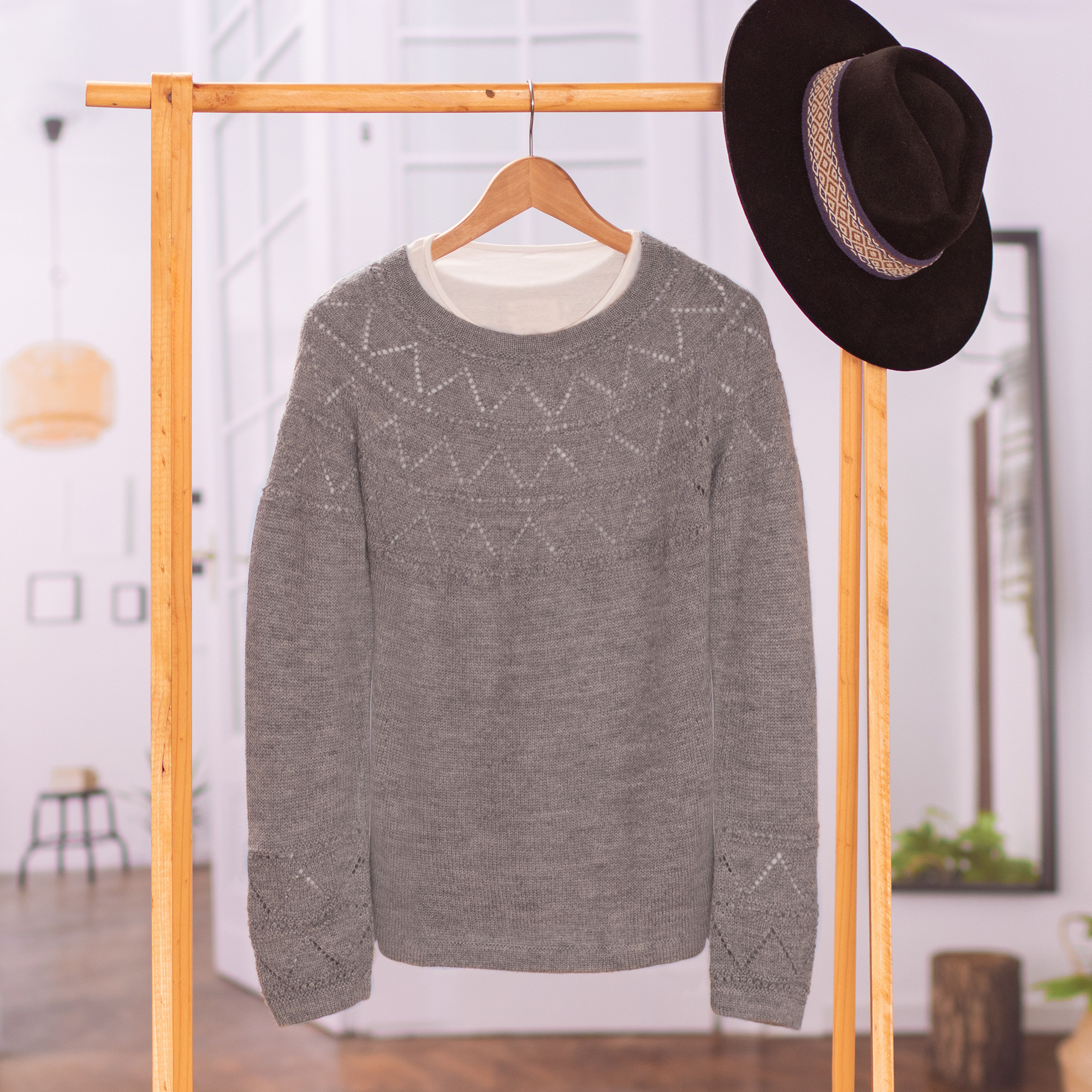 Marleny Quijahuaman of Peru designs a warm and sumptuously soft pullover knit sweater in light grey baby alpaca, the finest fleece from the first shearing of the season. The long sleeve sweater has a lovely eyelet zigzag pattern at the yoke and sleeve cuffs.