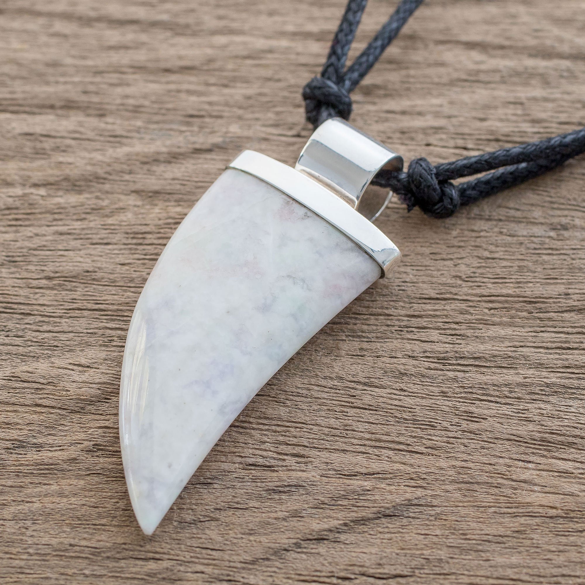 Hand-carved of natural lilac jade, a wide tusk centers this striking pendant necklace from Guatemala. Zandra Lorena Sajbin designs the necklace, housing the tusk in high-polish sterling silver. The pendant centers a length of adjustable cotton cord.