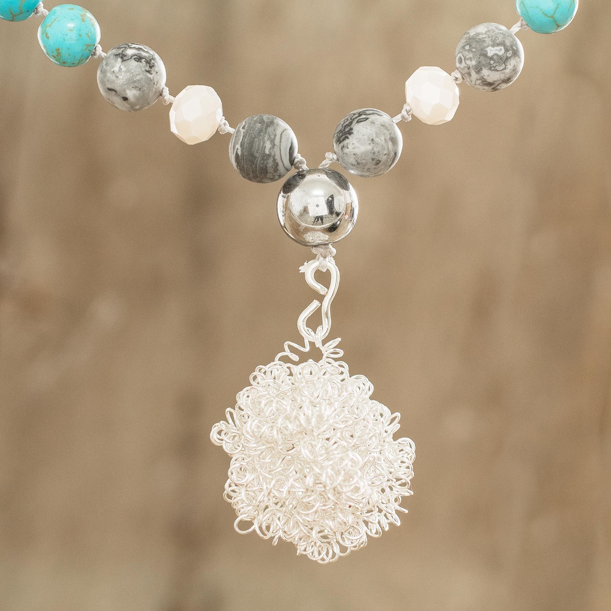 This long and lovely necklace is from Xiomara Valverde in Costa Rica. She combines beads of agate, pearlescent crystal and reconstituted turquoise with gleaming stainless steel and a unique polymer-coated wire pendant.