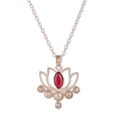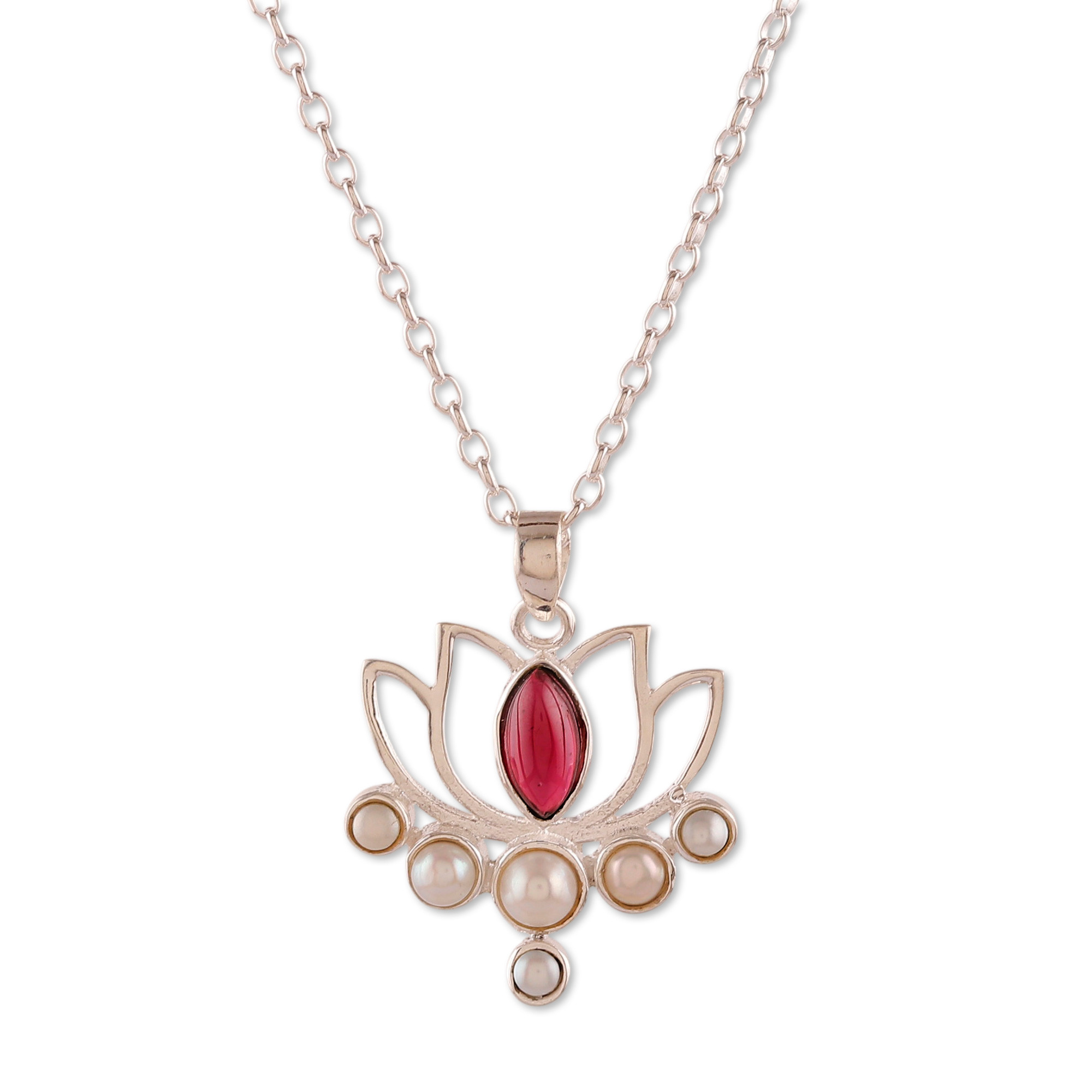 A graceful lotus flower motif adorns this elegant sterling silver pendant necklace by India's Shivani Choudhary. At the center of the pendant rests a smooth, marquise-shaped garnet, its deep red hue drawing the eye with a sense of warmth and vitality. The base is adorned with six luminous cultured pearls, each set to complement the organic form of the flower. The fiery garnet and the iridescent pearls create a beautiful contrast that evokes balance and serenity.