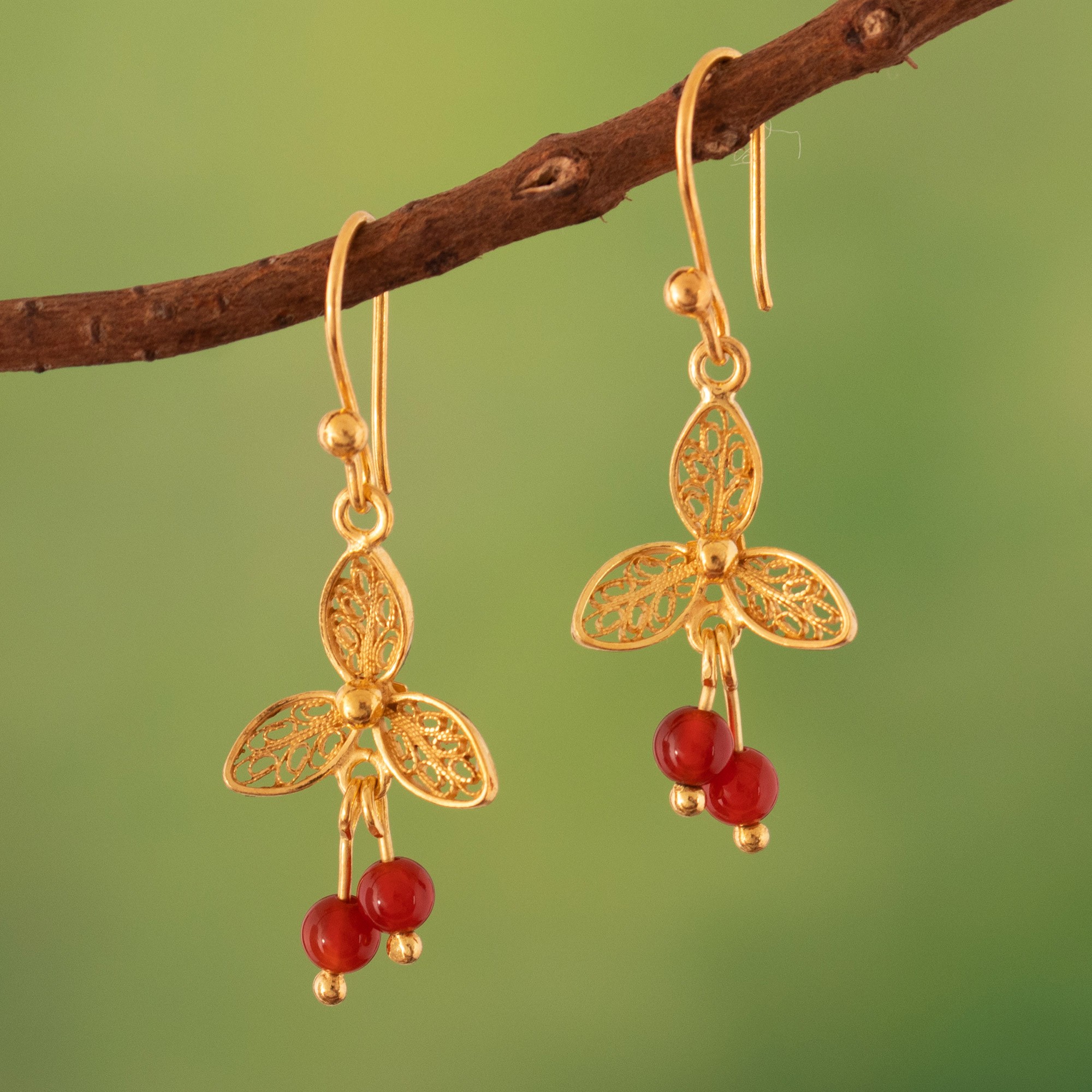 Lotus Flower Gold-Plated Carnelian Filigree Dangle Earrings, 'Red Lotus Flower'