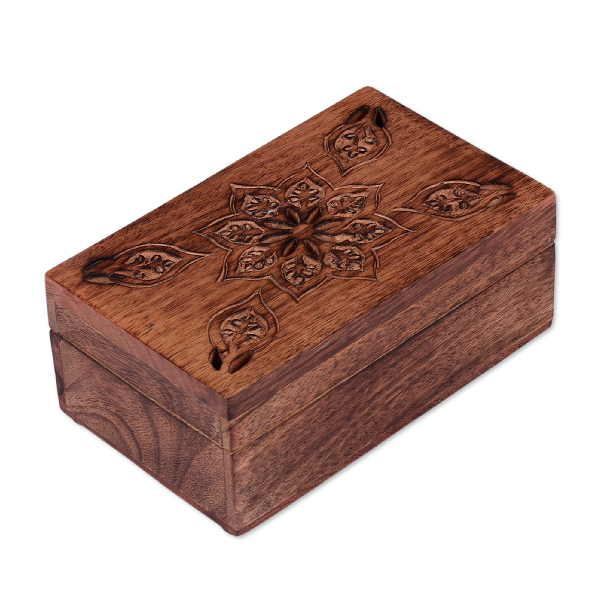 Keep your treasures under the beauty of a spring-inspired mandala. India's Mela Artisans use burnt mango wood pieces to create this practical box, decorated with traditional lotus flowers as an omen of peaceful and prosperous times.