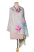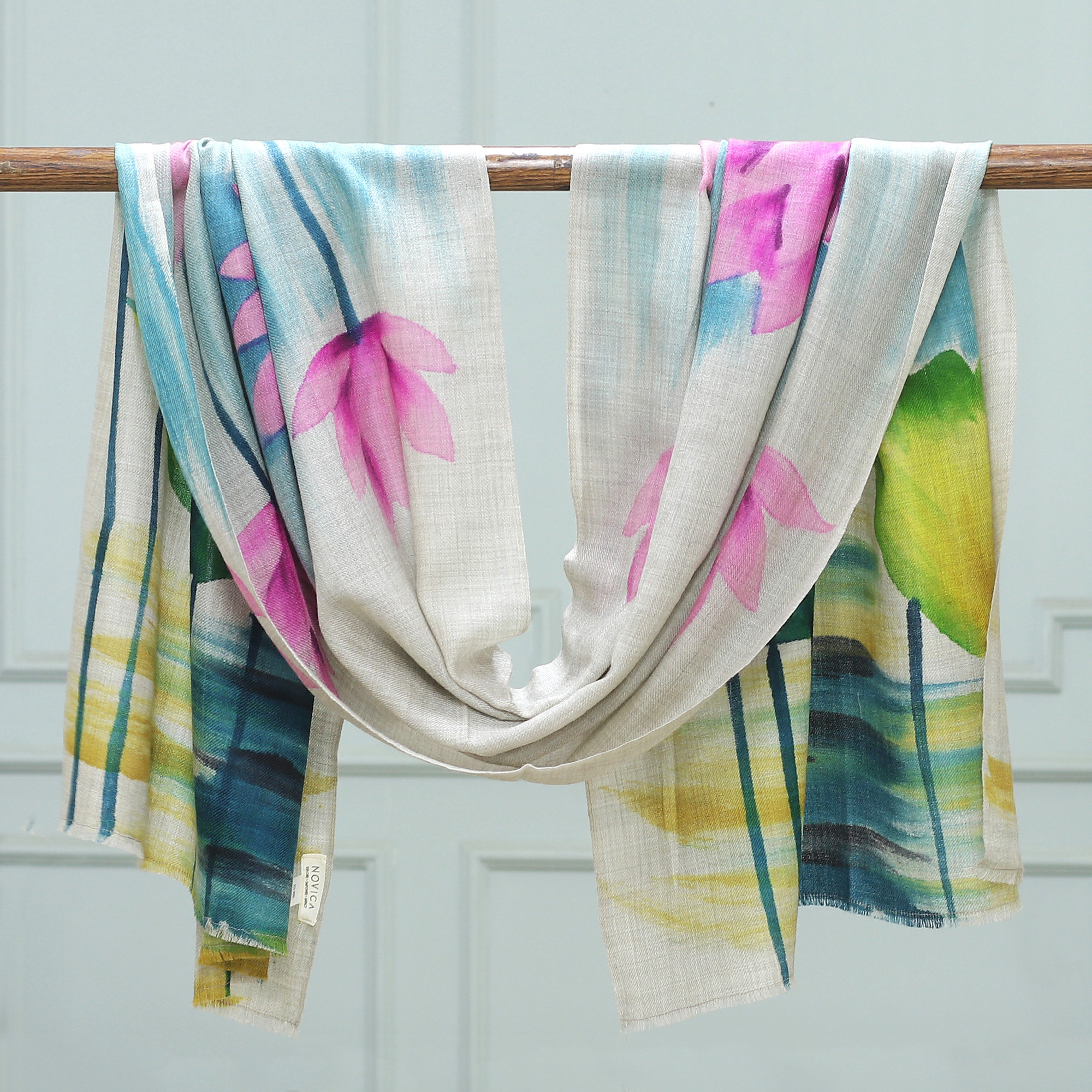Made to evoke the grace of the lotus flower, this hand-painted shawl comes from the Indian region to take you to a realm of beauty. Artisan Shuja Ahmed uses pink, green and blue colors to create the shawl's floral scene, allowing a unique look.