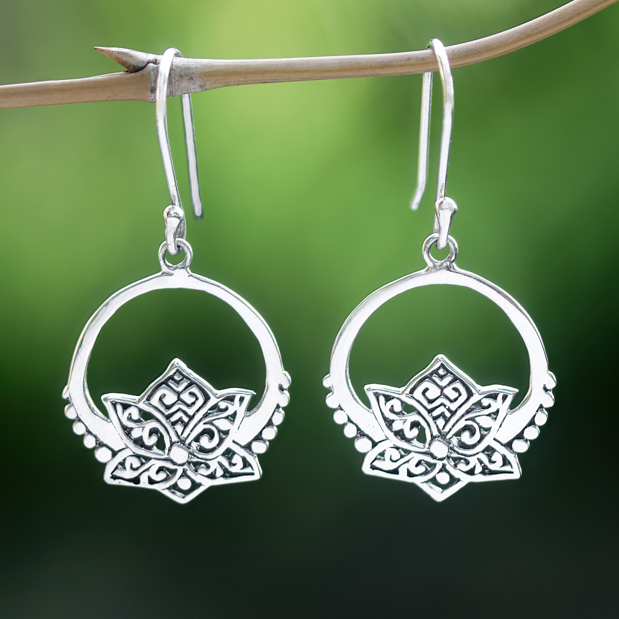 Lotus-Themed Sterling Silver Dangle Earrings Made in Bali, 'Lotus Pond'