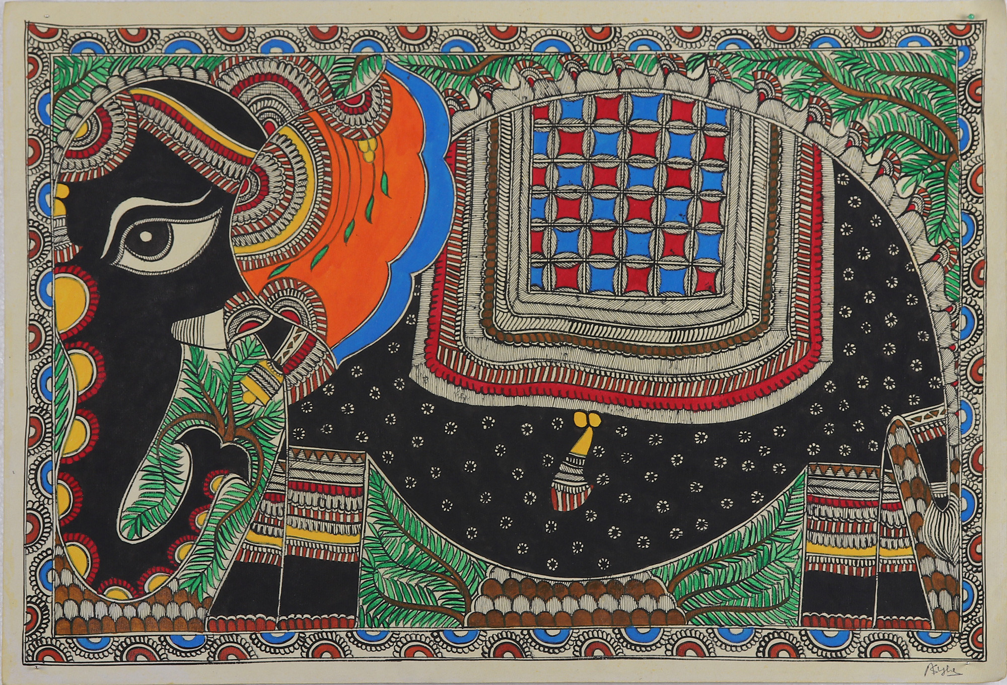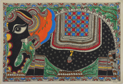 This vibrant Madhubani painting is crafted on handmade paper with natural dyes by India's Devendra Kumar Jha and Family. Its star is a majestic elephant adorned with intricate ornaments, patterned textiles and vibrant embellishments. The pachyderm's body is painted in bold black, richly detailed with fine motifs, while its head features bright hues of orange, blue, red and green, symbolizing festivity and grandeur. A decorative saddle cloth with checkered patterns of red and blue rests upon its back, enhancing the ceremonial aura. Surrounding the elephant are stylized borders of foliage and rhythmic geometric designs, hallmark traits of Madhubani's meticulous style.