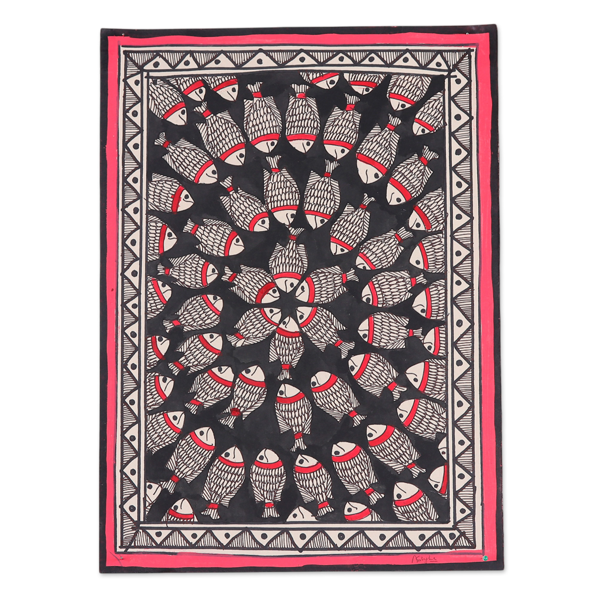 This extraordinary Madhubani painting is filled with rhythmic repetitions of fish, a popular motif in Mithila art symbolizing fertility, prosperity and harmony with nature. India's Devendra Kumar Jha and Family create the stunning composition using natural dyes on handmade paper. The fish are stylized with intricate line work, showcasing the characteristic precision of the Madhubani school. The interplay of black, white and red hues creates a strong visual impact, with dense patterns filling every space in keeping with the folk tradition of leaving no area blank. The border is carefully adorned with geometric motifs, framing the central design and enhancing its symmetry.