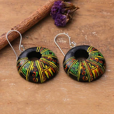 Madhubani-Themed Hand-Painted Ceramic Dangle Earrings, 'Madhubani Glory'