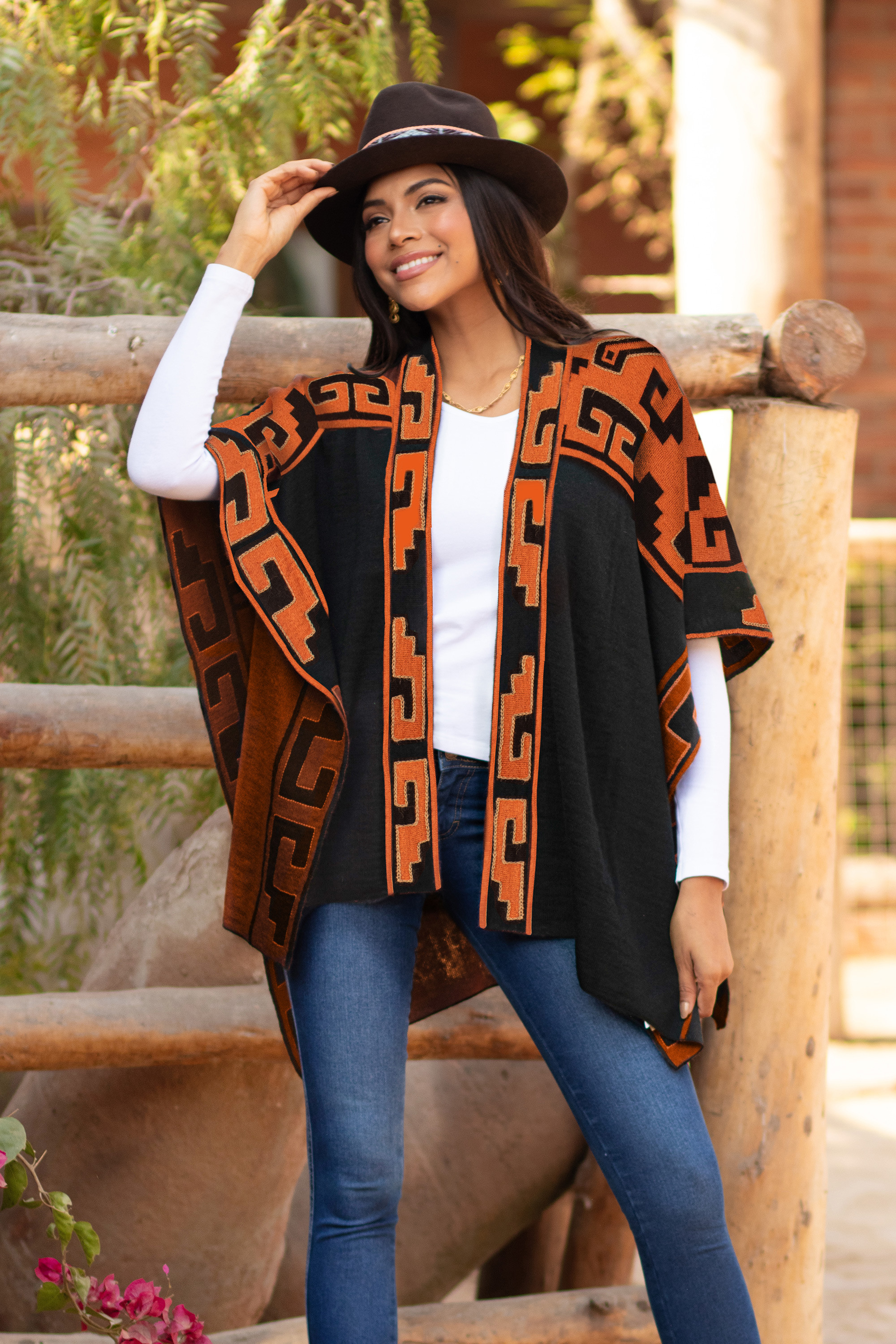 Peruvian artisan Waldo Berrios draws inspiration from the textiles of the ancient Inca as he designs this feminine ruana. Knit from a luxuriously soft alpaca blend, this reversible ruana combines hues of black and mahogany that create geometric swirl patterns along the shoulders and hems.