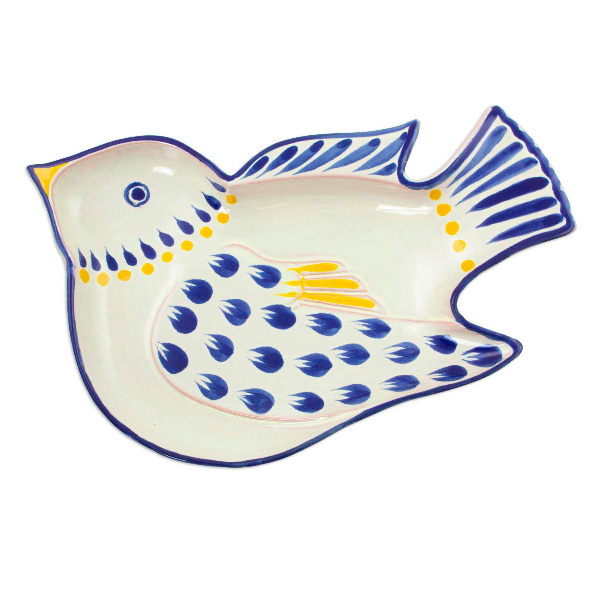 Crafted of ceramic, a songbird wings its way across Mexican skies. A master of Mexico's colonial Majolica ceramics, Gorky González creates this whimsical bird theme canapé dish. He signs his work "AT," for alfarería tradicional (traditional ceramics).