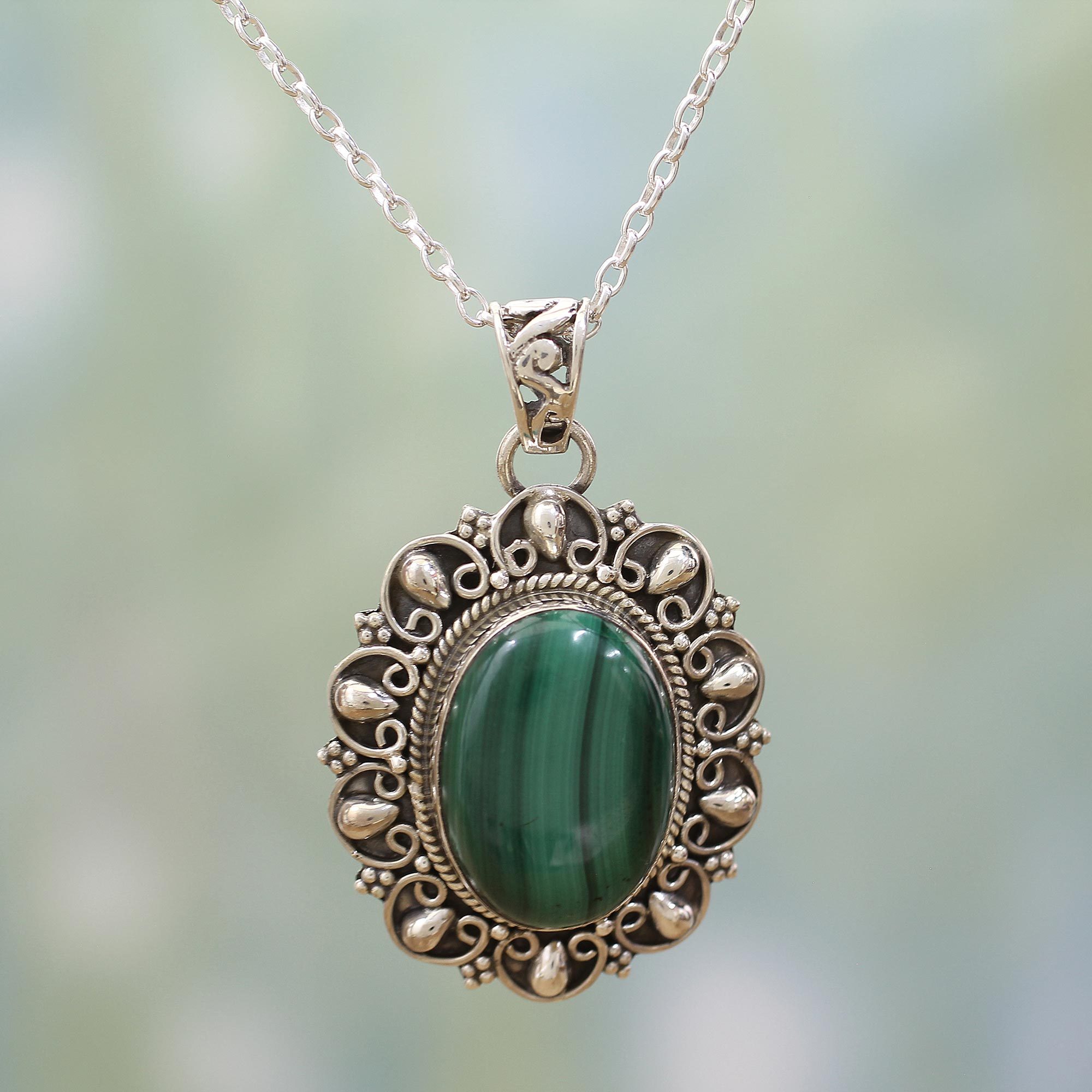 Indian artisan Alok Jain designs this sophisticated pendant necklace. Handcrafted from sterling silver, the intricately engraved pendant holds deep green malachite that is both elegant and alluring.