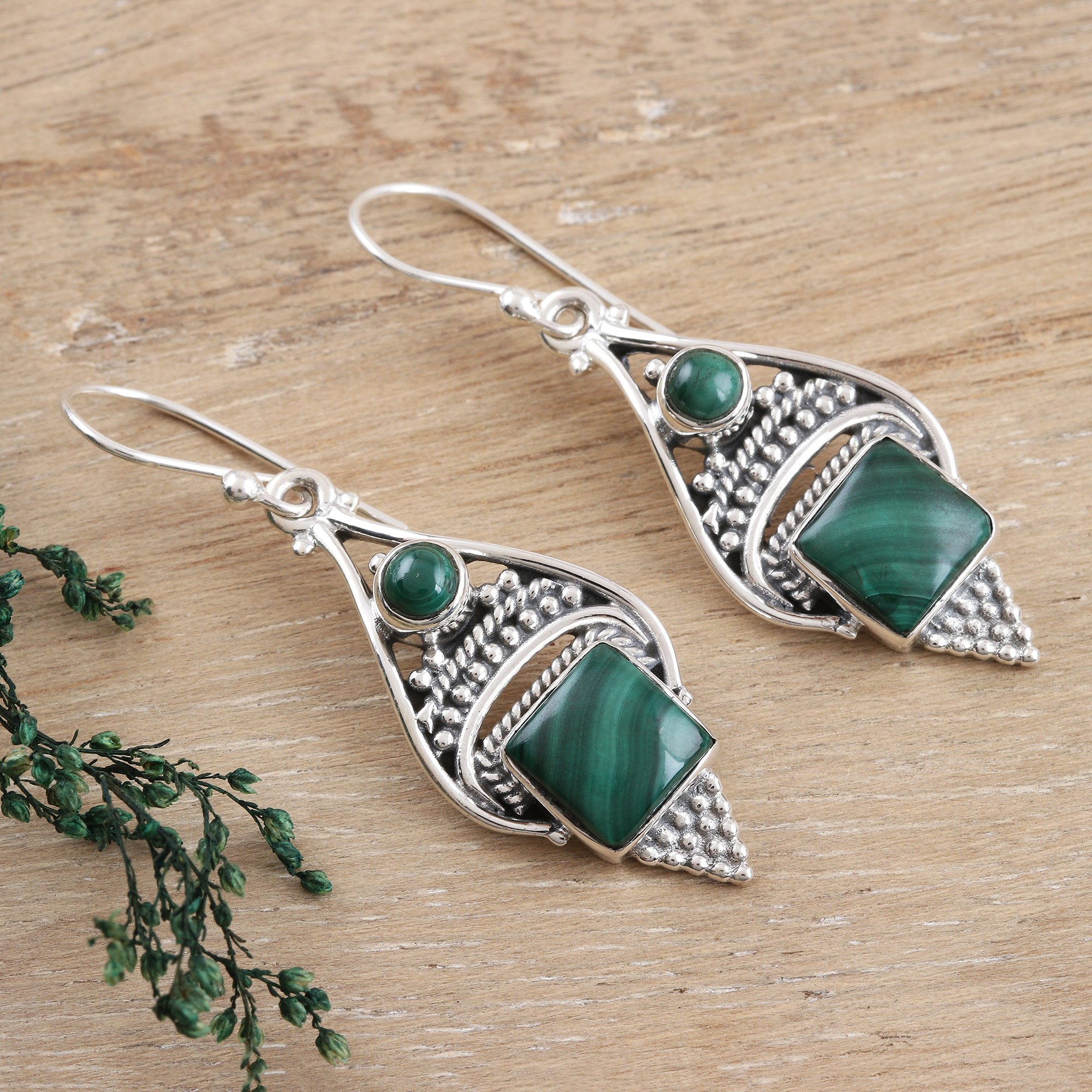 Considered to be a stone of transformation, malachite heals on physical and emotional levels, drawing out impurities and stimulating the Life Force within each of us. These intricate dangle earrings from Neeru Goel of India start with tiny droplets of sterling silver above small, round malachite cabochons. The design gives way to an intricate pattern of silver roping and balls before culminating in square, bezel-set malachite cabochons.