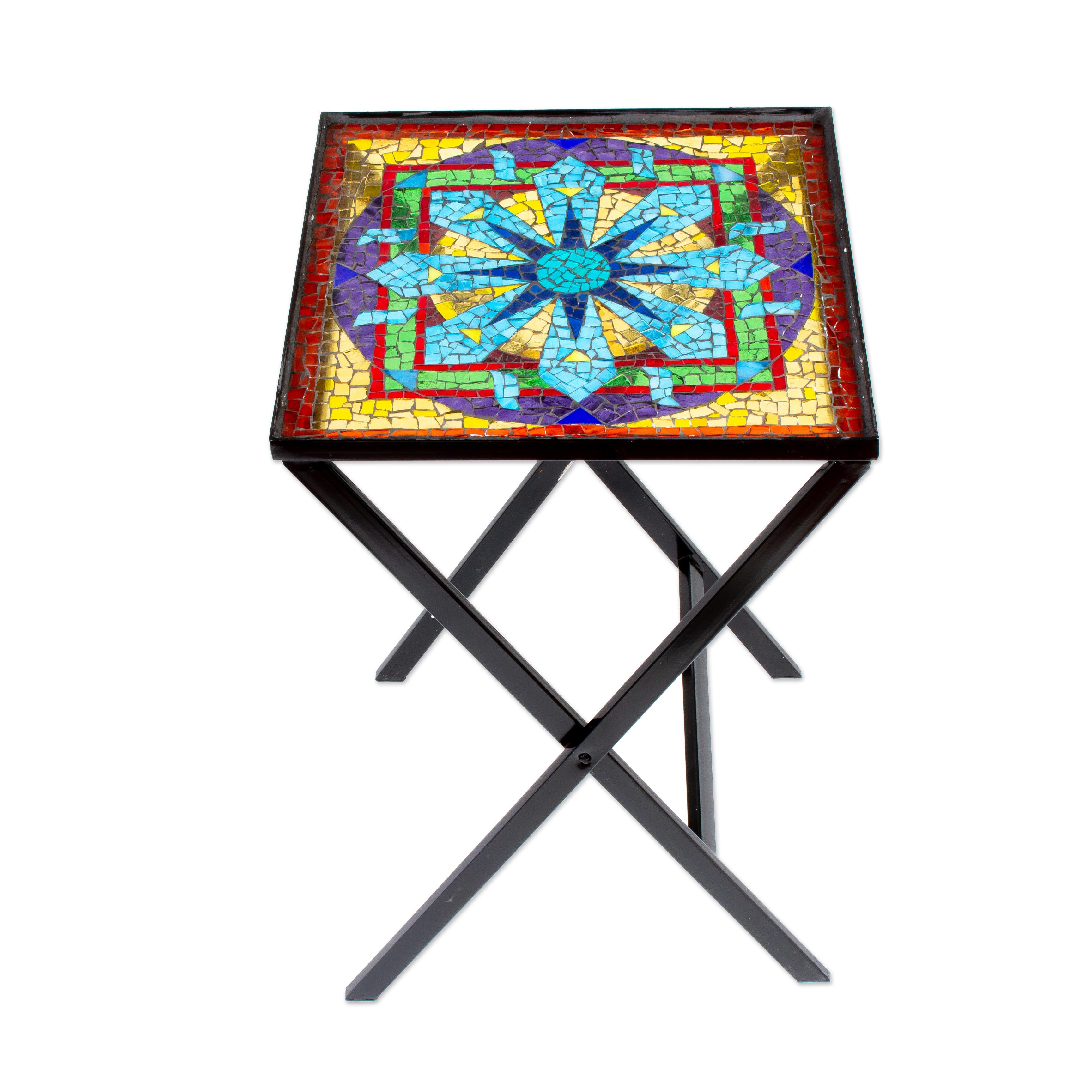 Perfect for both indoor and outdoor use, this beautiful folding accent table is created by artisans of Vidri Arte. They depict a mandala in colorful glass mosaic, each piece placed by hand and set into a black wrought iron base.