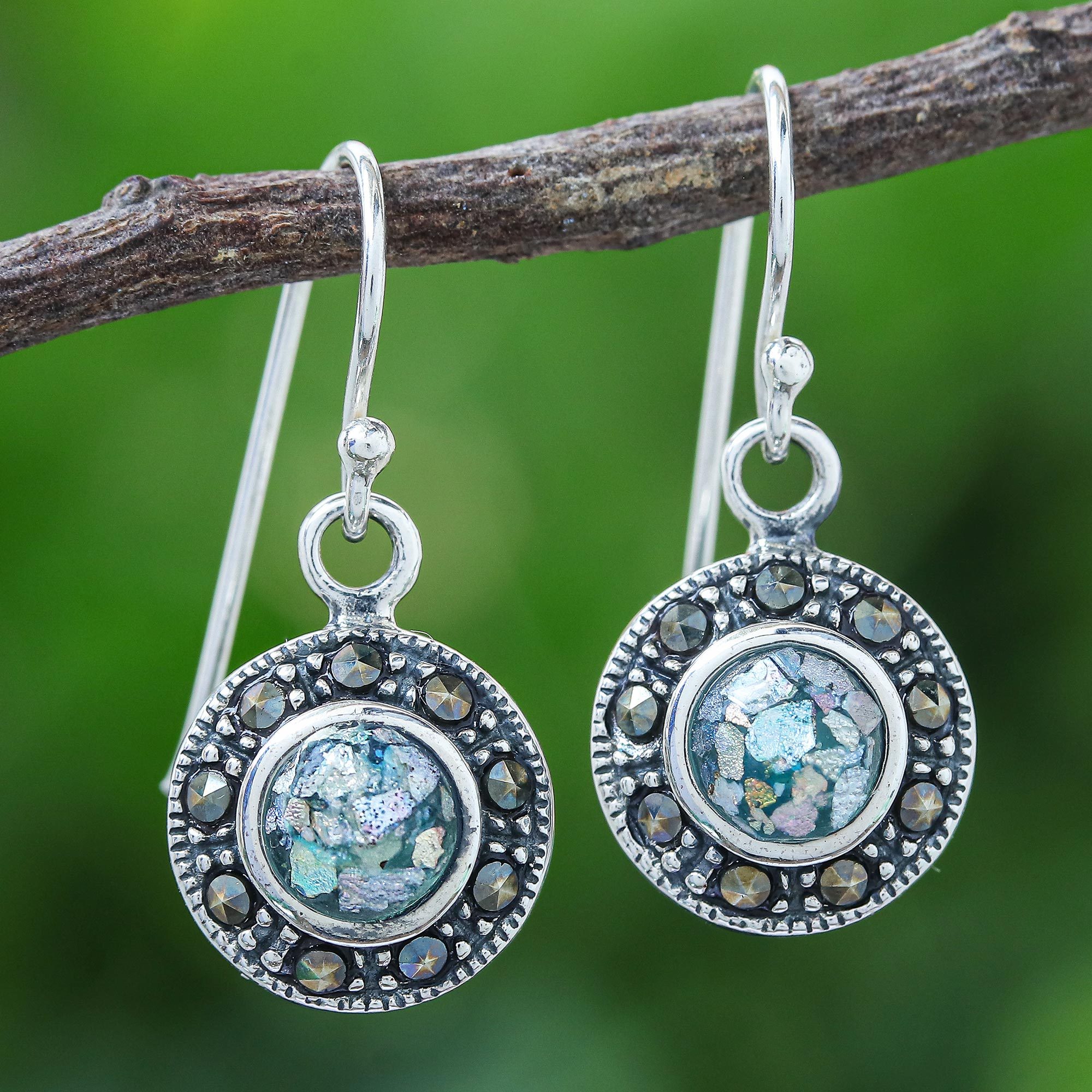 Marcasite and Roman Glass Dangle Earrings, 'Arctic Night'