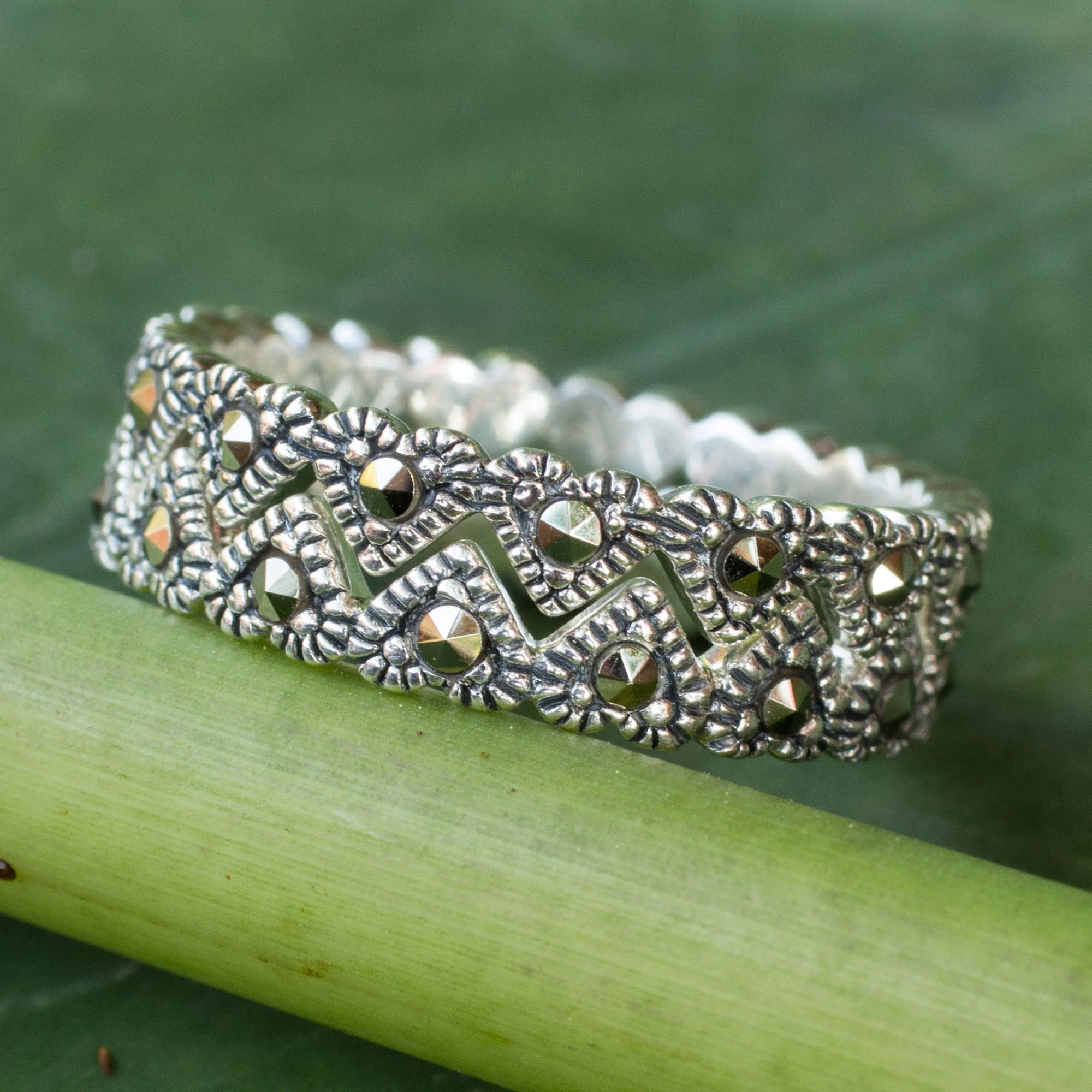 Centered with sparkling marcasite, hearts align in romantic rings. Narinee works in sterling silver to create a pair of bands that nestle together in an expression of harmonious love.