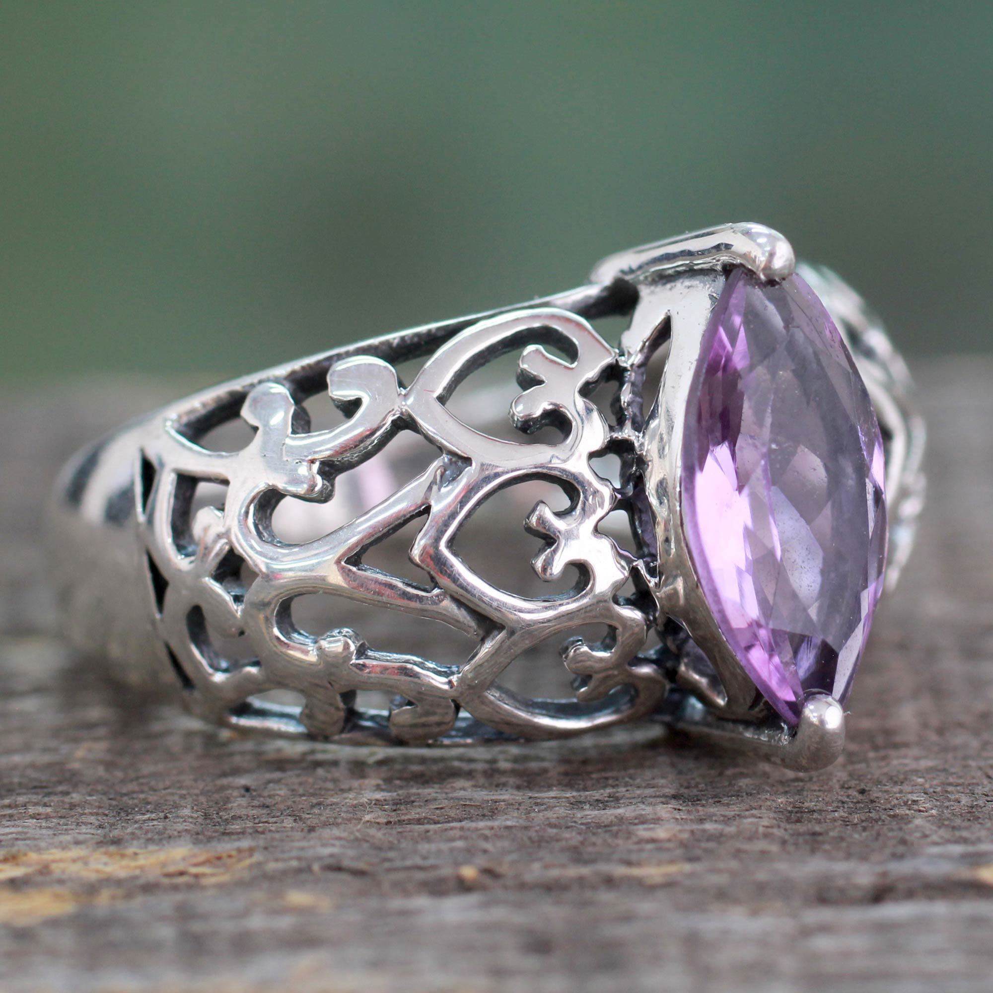 Marquise Amethyst Single Stone Silver Ring from India, 'Love Sonnet'