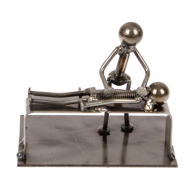 Scrap metal has never been so relaxing. This masseuse-themed recycled metal figurine captures a moment of blissful tension release with surprising warmth and humor, one bolt-and-rod figure leaning attentively over another stretched out flat on a table, every salvaged screw and coil working together to tell a scene that is instantly recognizable and genuinely delightful. Handcrafted from discarded metal and scrap materials, Mexican artisan Armando Ramirez's design carries an eco-friendly spirit without taking itself too seriously, making it the perfect desk companion for a massage therapist, a wellness enthusiast or anyone who simply appreciates a good inside joke rendered in recycled metal.