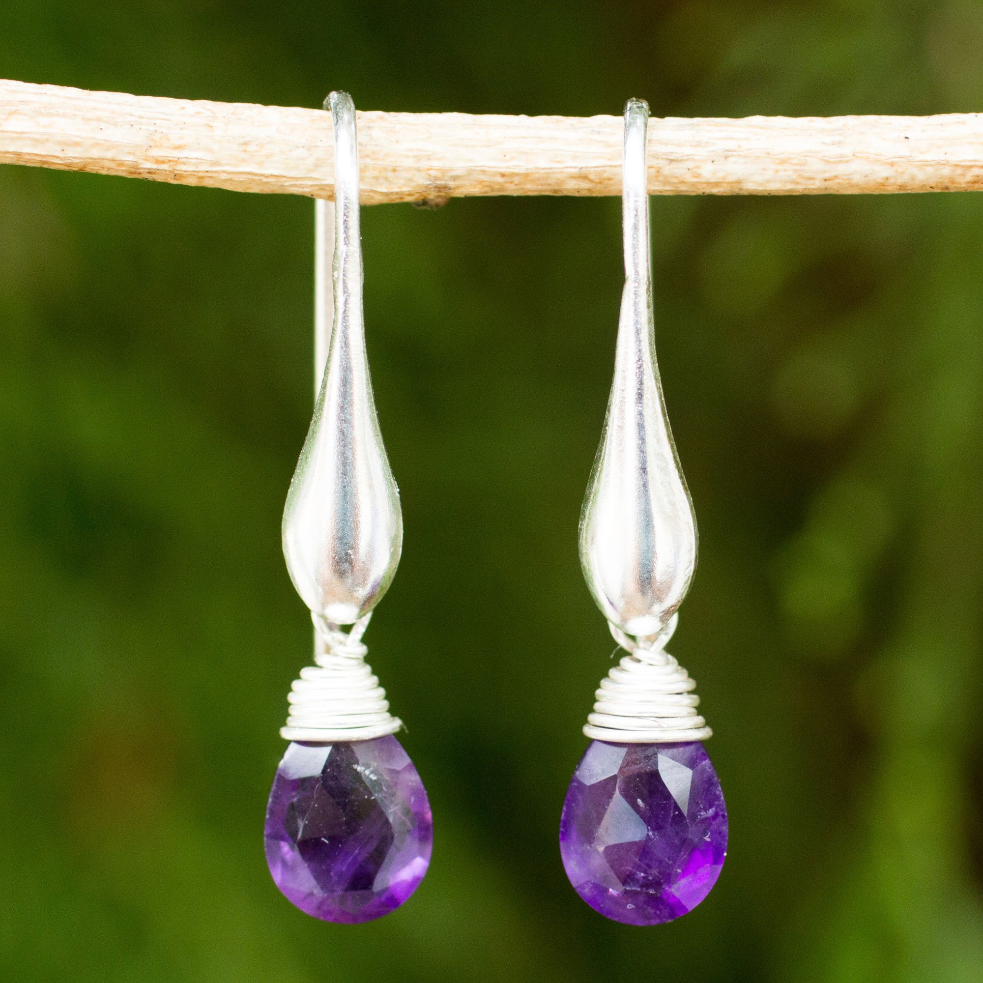 Decidedly sophisticated, these earrings from Thailand's Khun Boom feature the frosty glow of matte finish sterling silver. The soft finish beautifully complements the amethyst briolettes that swing beneath. The dangle earrings feature 2.5 carats of the faceted gems.