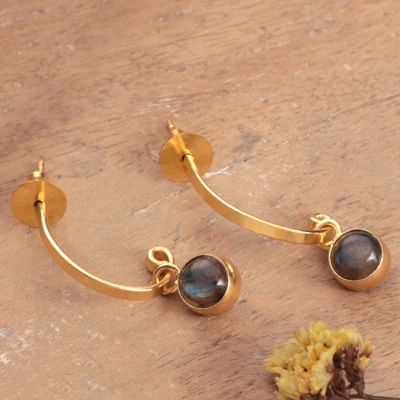 Matte-Finished Brass Dangle Earrings with Labradorite Stones, 'Stylized Haze'