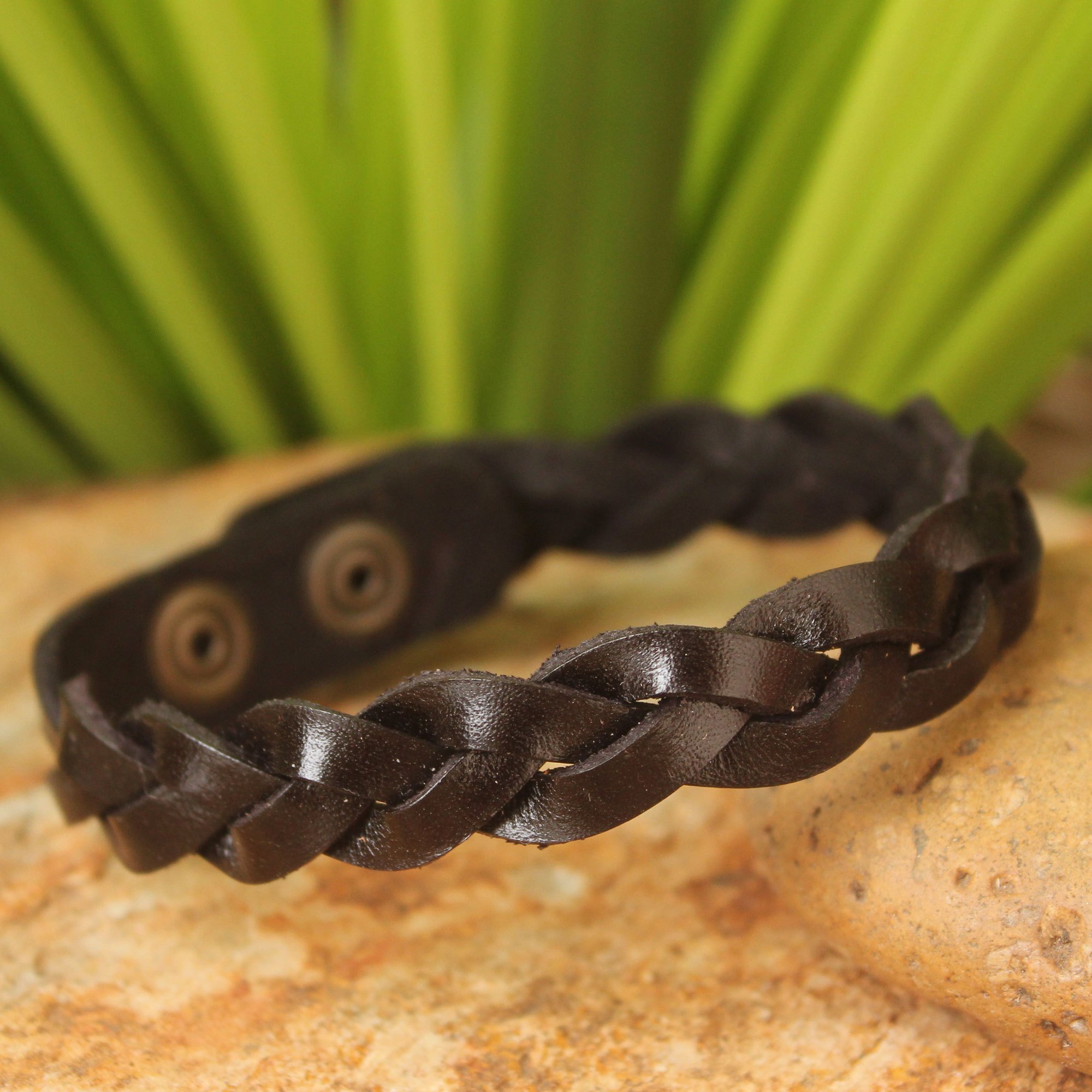 Chaloemphon braids three sleek leather ribbons by hand to evoke meandering Thai rivers. Created for men, the black wristband bracelet is adjustable in length.