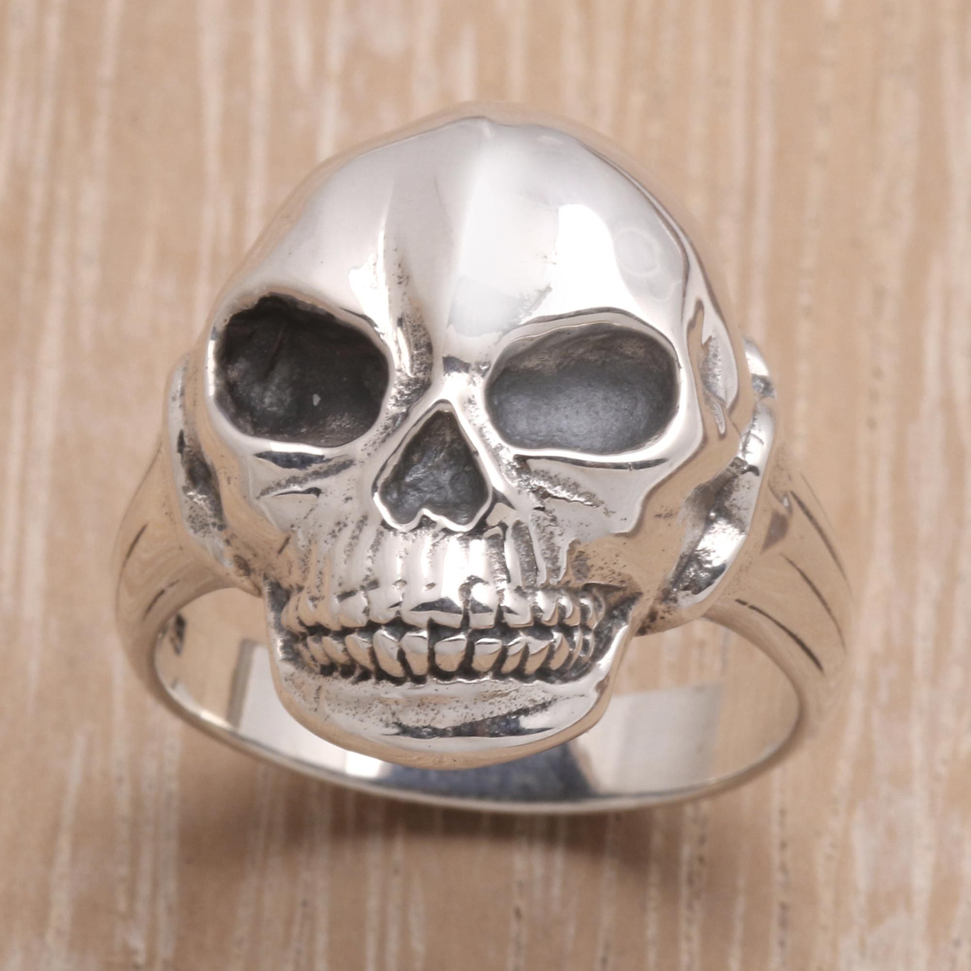Illuminated by moonlight, a skull smiles a deadly smile in a design by Bali's Putu Gede Darmawan. The ring is crafted with sterling silver and finished by hand with expressive detail.