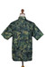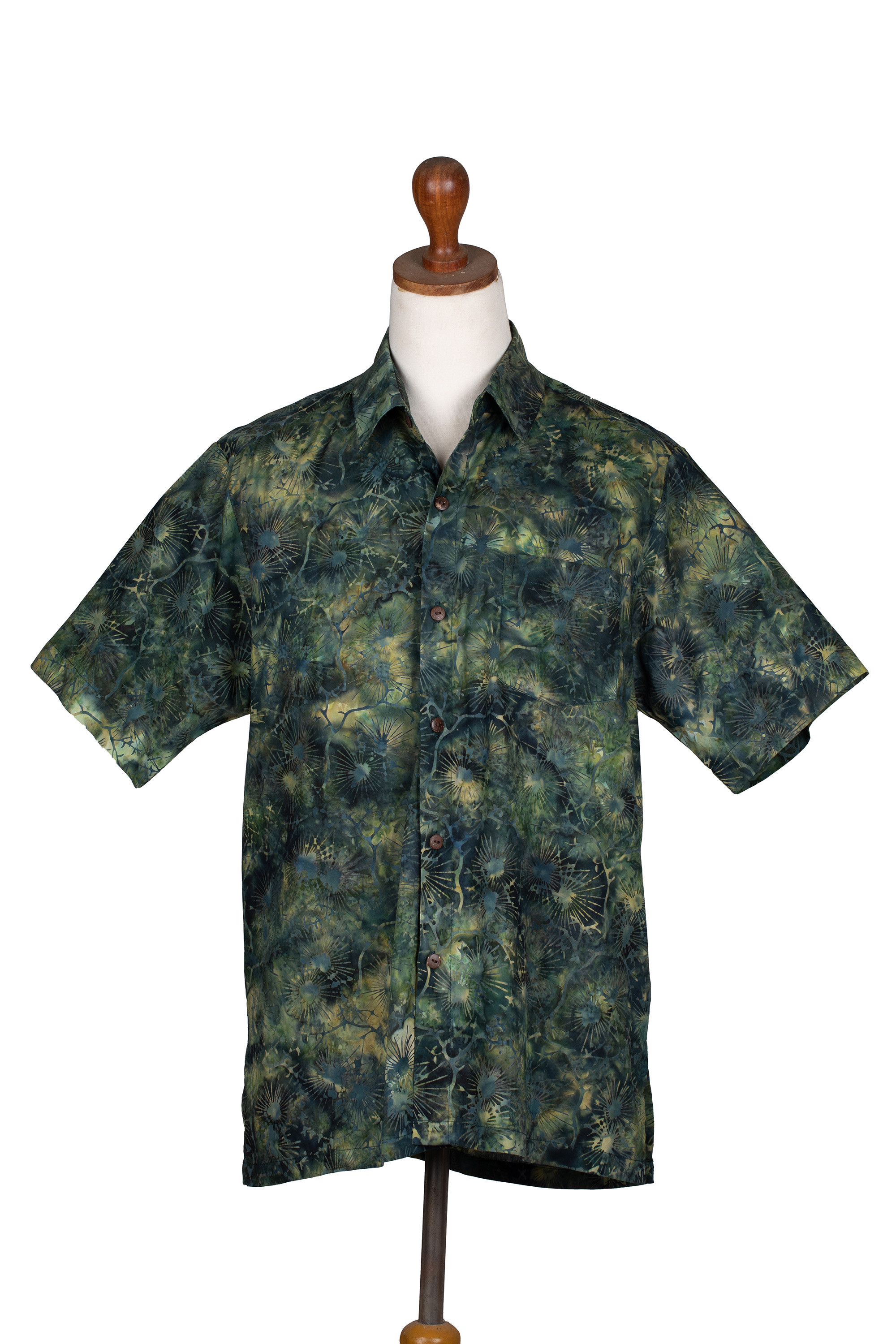 In tones of green, blue and golden yellow, abstract firework motifs burst across this short sleeved cotton shirt. Hand-stamped and dyed using traditional batik artistry this mens shirts is designed by Bali's Ketut Suwitra. Featuring coconut shell buttons, a chest pocket, and classic relaxed fit.