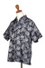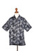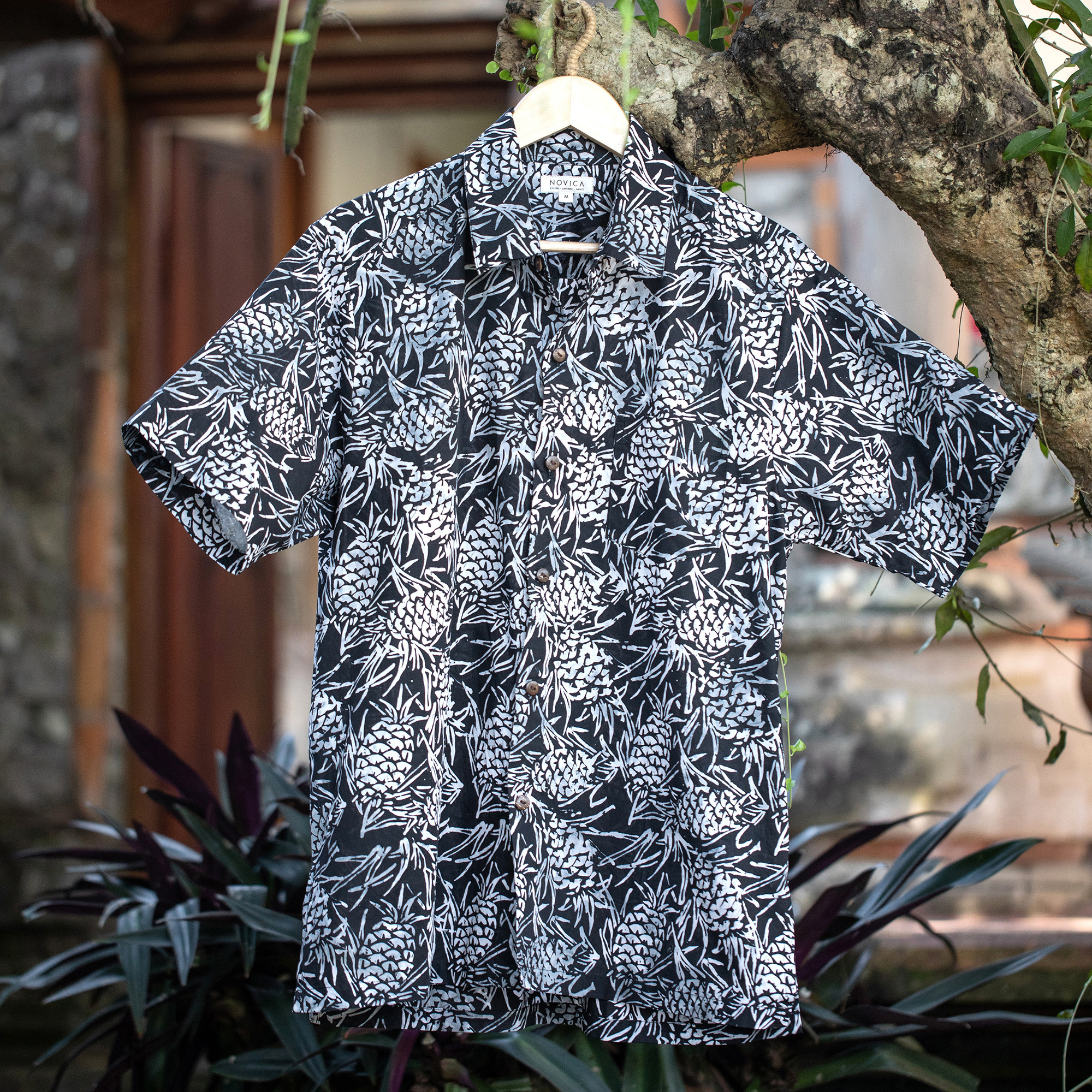 A monochromatic black and white color way gives a contemporary update to a tropical style pineapple print. Created using traditional hand-stamped wax resist batik in Bali by Ketut Suwitra. This 100% cotton short sleeve shirt features coconut shell buttons and a chest pocket.