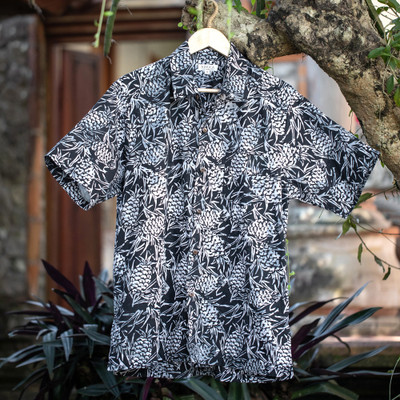 Men's Batik Cotton Shirt with Hand-Stamped Pineapple Motifs, 'Black Pineapple Garden'