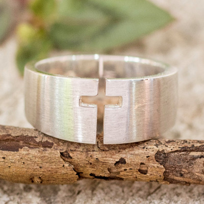 Men's Brushed-Satin Sterling Silver Cross-Themed Domed Ring, 'First Faith'