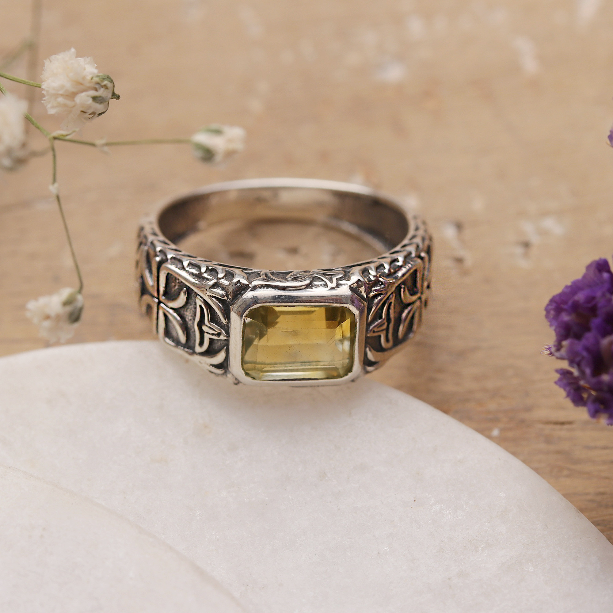 Parul of India presents a victorious men's single-stone ring. A faceted rectangle of citrine is set in a wide sterling silver band ornamented with gallant details. Oxidation is artfully applied to bring out the intriguing abstract motifs, transforming the piece into a dapper element.