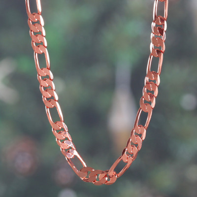 Rhythm matters, and Indian designer Sumit Dhawan gets it. This copper Figaro chain necklace for men plays with patterns like a drummer plays with tempo: three short links followed by one elongated beat, repeating in perfect cadence around your neck. The flattened links catch light at every angle, turning that signature rose-gold copper tone into a shifting display of warm metallics that refuse to be boring. It's a chain with personality, designed for men who appreciate when tradition gets just the right amount of swagger.