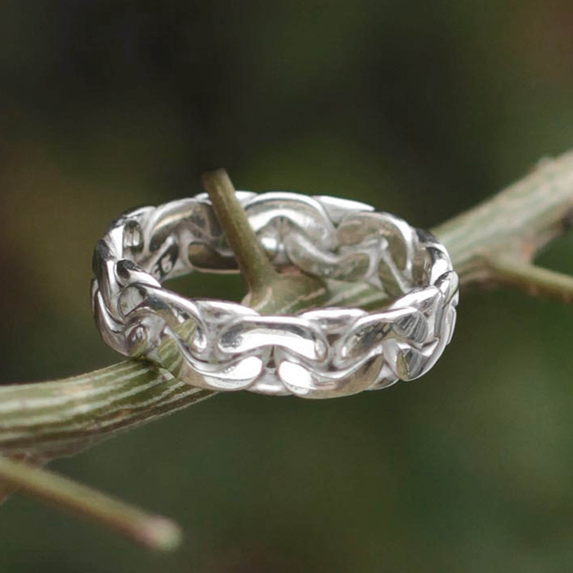 A unique braid evokes the gentle movement of waves. Designed by Carmen Anocibar from the Andes, this ring is crafted from .925 sterling silver. Its shape and high-shine finish make it a pleasing statement for the modern man.