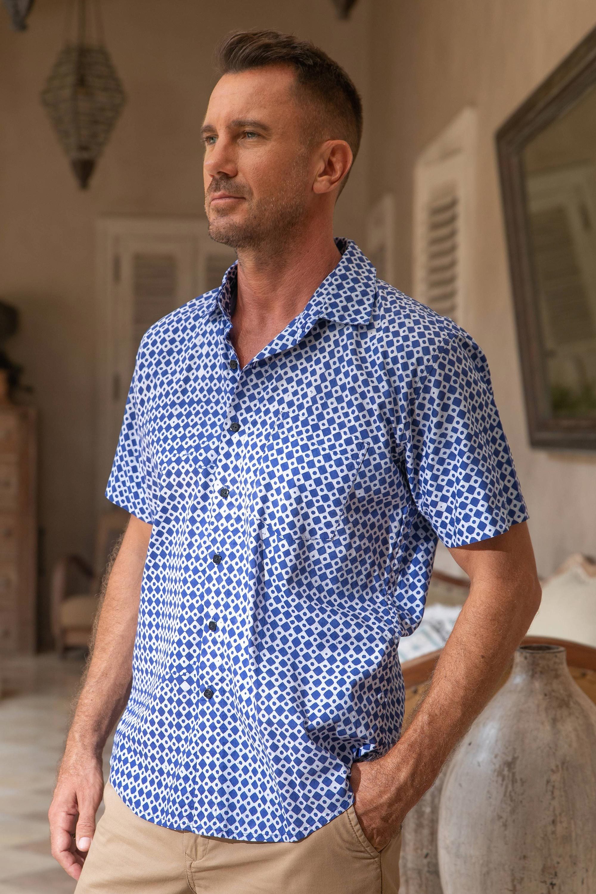 Men's Hand-Stamped Blue and White Cotton Shirt, 'Blue Kites'