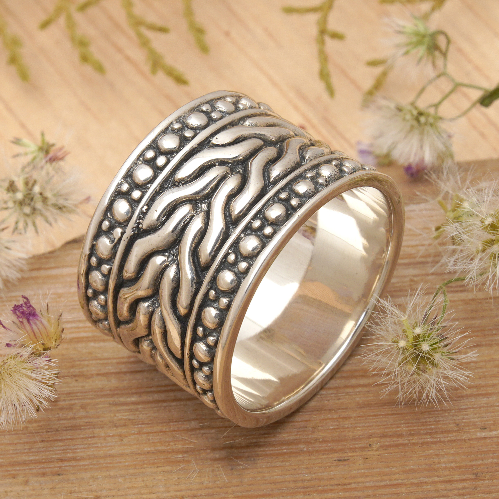 "For this design I was inspired by a stream passing near my home," explains the talented Putu Gede Darmawan. The flowing effect is masterfully conveyed through the patterns of this hand crafted sterling silver ring.