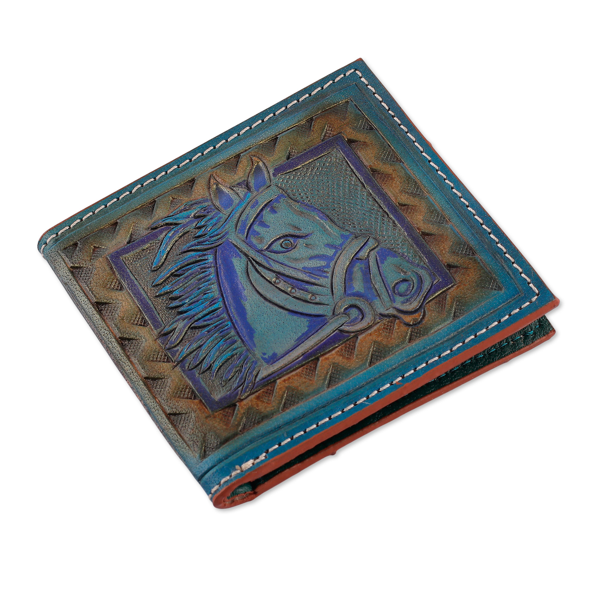 Men's Horse-Themed Teal Turquoise Leather Wallet from India, 'Horse Nobility'